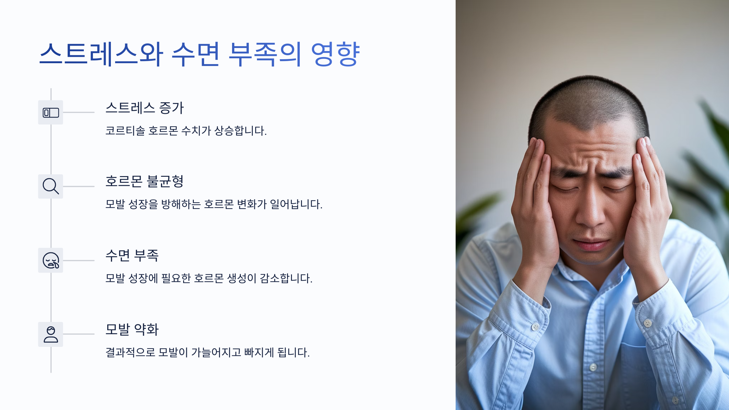 스트레스는 탈모의 가장 치명적인 원인 중 하나예요. 정신적인 스트레스가 심해지면 자율신경계가 불균형해지면서 두피 혈류량이 줄고, 모근에 영양 공급이 제대로 되지 않아요. 결국 머리카락이 빠지고 성장도 더뎌져요.