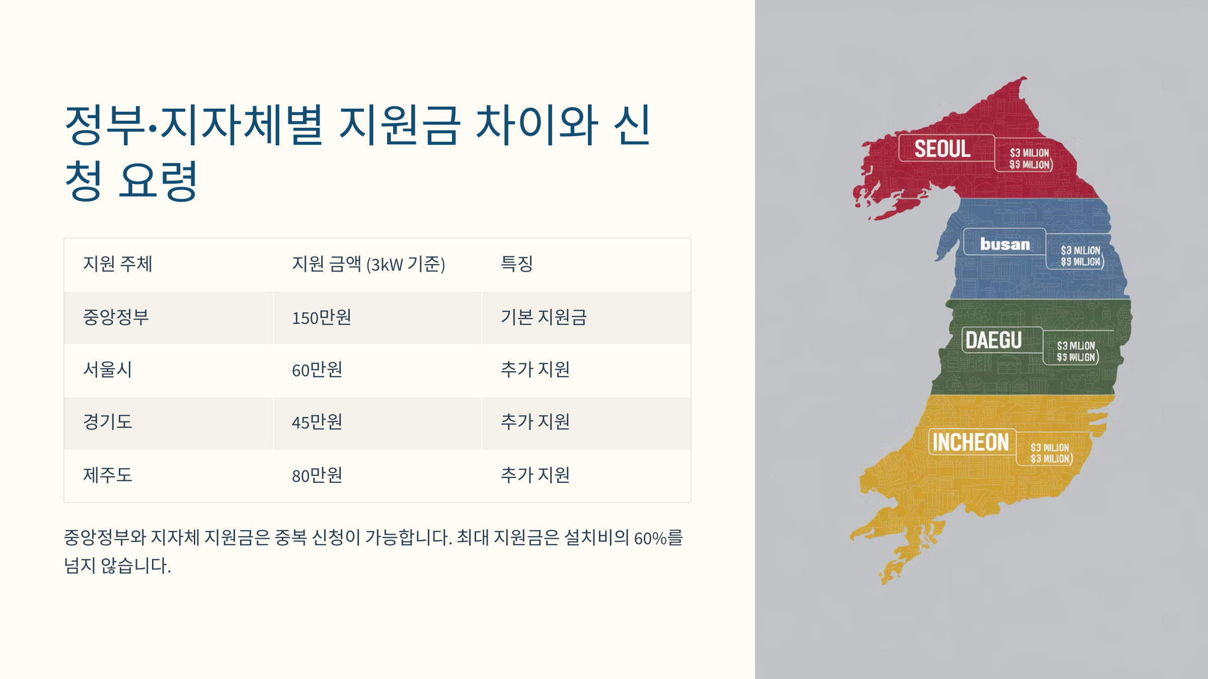 정부 지원금은 전국 공통 기준이지만, 지자체 지원금은 지역별로 금액과 조건이 천차만별이에요. 같은 3kW 설치라도 서울은 200만 원, 경기 북부는 100만 원일 수 있어요.
