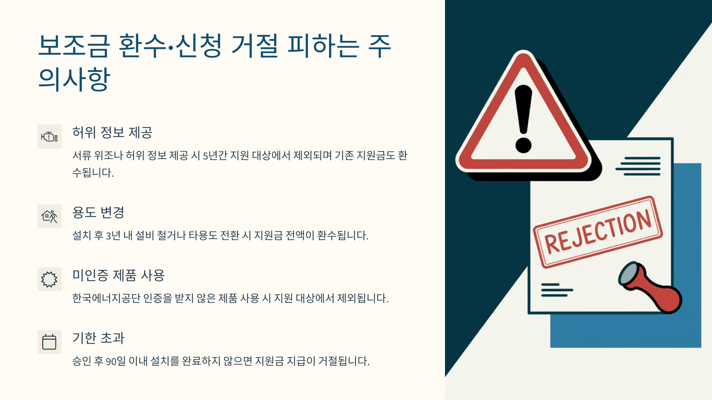 또한 서류 허위 제출, 무등록 시공사 이용, 부적격 장소 설치 등도 지원금 지급 거절 사유가 돼요. 실제로 매년 수백 건 이상 환수 사례가 보고되고 있어요.