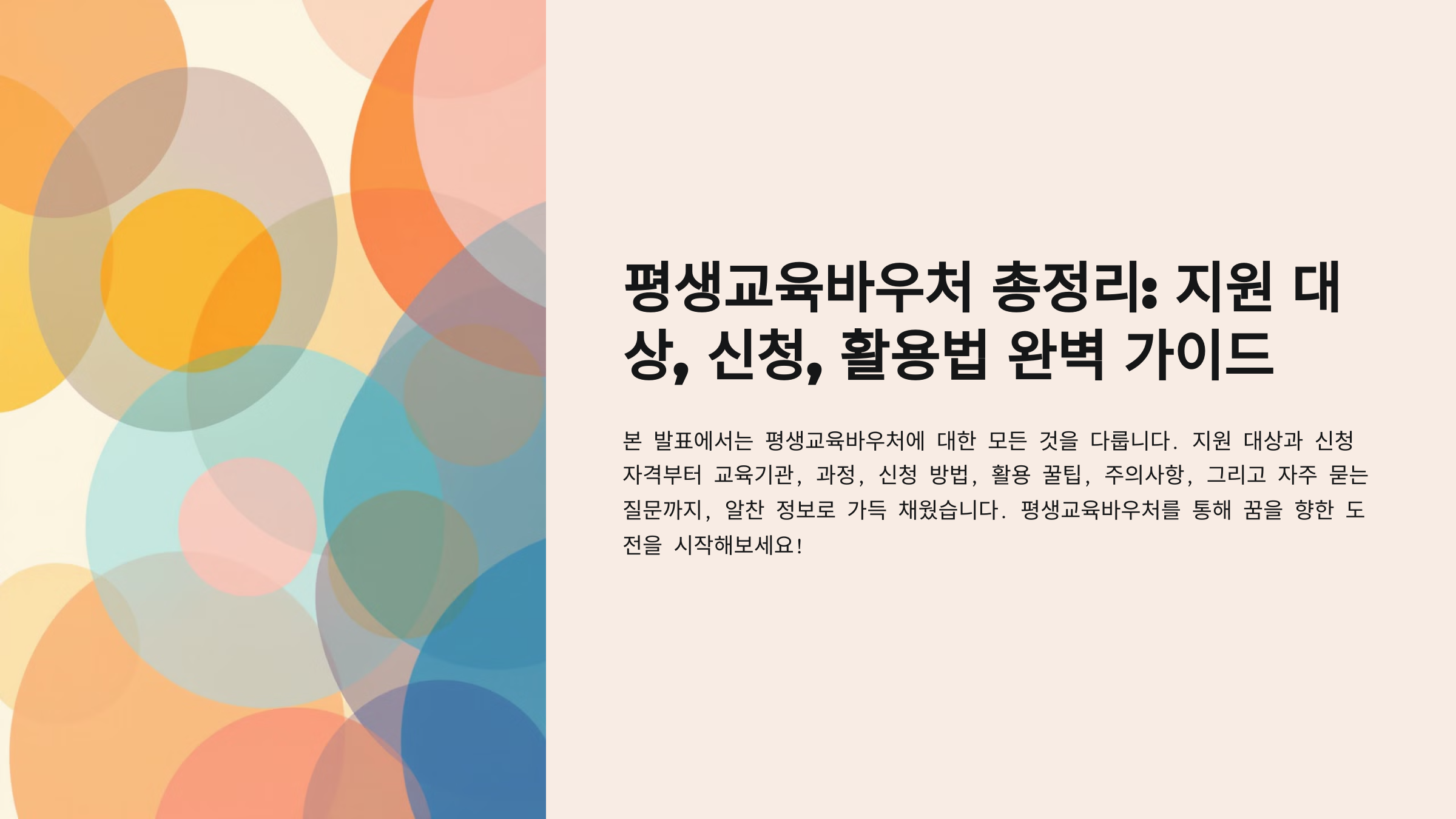 이 글에서는 평생교육바우처에 대한 모든 정보를 총정리했어요. 신청 대상, 사용 가능한 교육기관, 바우처 활용법까지 꼼꼼히 알려줄 테니 끝까지 읽어 보세요!