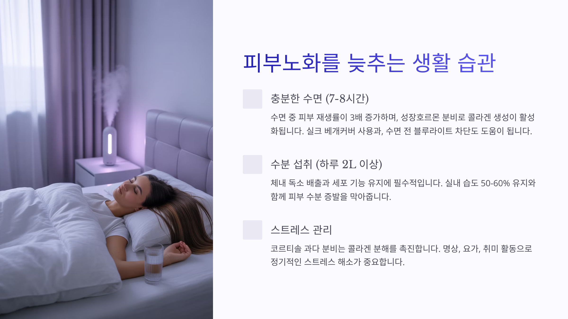 피부 노화는 유전적 요인도 있지만, 무엇보다 중요한 건 '생활습관'이에요. 매일 밤늦게 자거나 수분 섭취가 부족하면 피부 재생 능력이 떨어져요. 또 스킨케어 루틴이 불규칙하거나 유해한 성분이 들어간 제품을 사용하면 오히려 피부가 더 빠르게 늙어요.