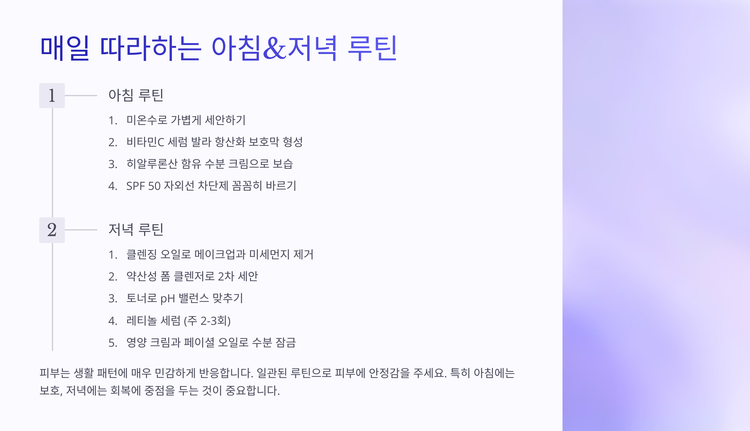 아침과 저녁에 하는 루틴은 단순한 습관이 아니라, 피부의 운명을 바꾸는 핵심이에요. 아침엔 피부를 보호하고, 저녁엔 재생을 도와줘야 해요. 루틴은 제품보다 순서와 방식이 더 중요해요!
