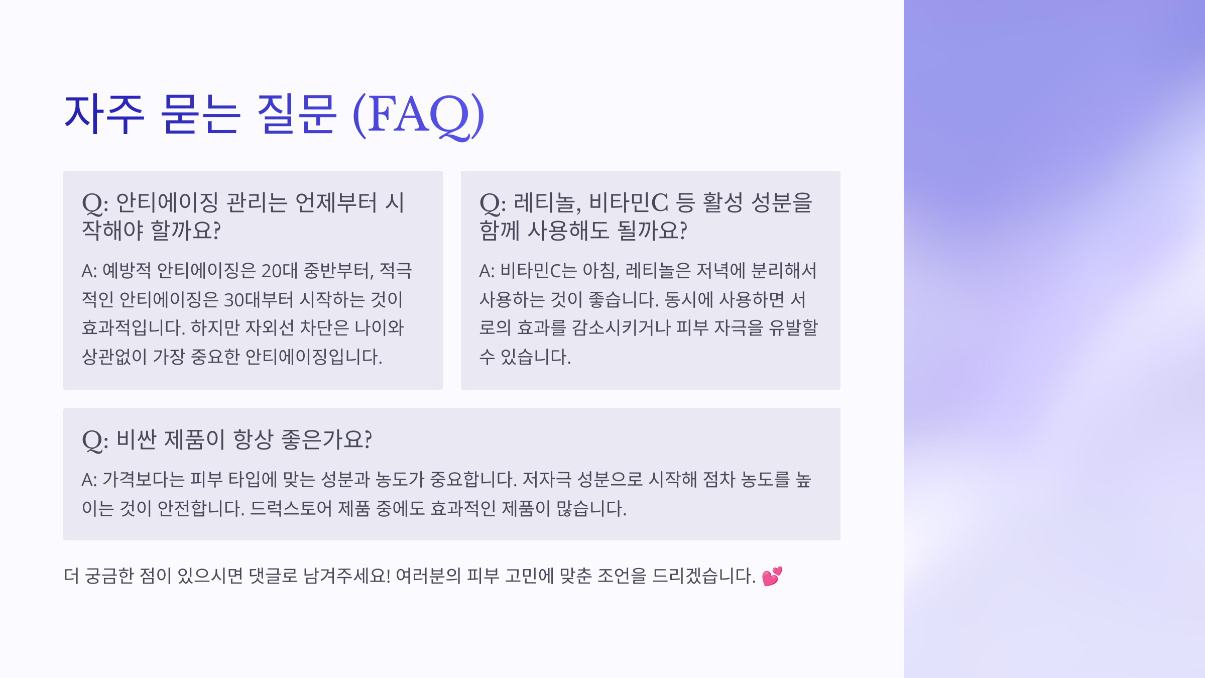 결국 중요한 건 화려한 제품이 아니라, 내 피부에 맞는 최소한의 루틴을 꾸준히 해주는 거예요. 나만의 루틴을 한 번 정하고 3주만 지켜보세요. 피부가 말해줄 거예요😉