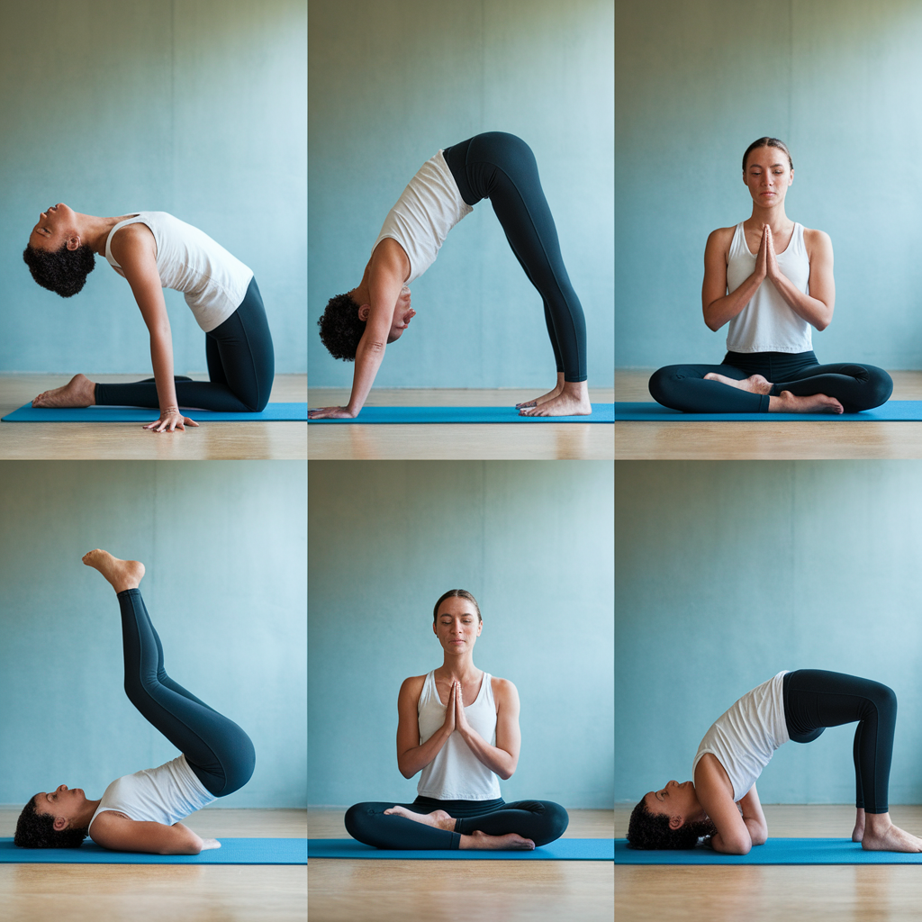 1. 벽에 붙어 바르게 서기 2. 양팔 벌려 어깨 젖히기 3. 등 대고 눕기 + 골반 조정 4. 팔 뒤로 깍지 껴서 당기기 5. 고개 천천히 뒤로 젖히기