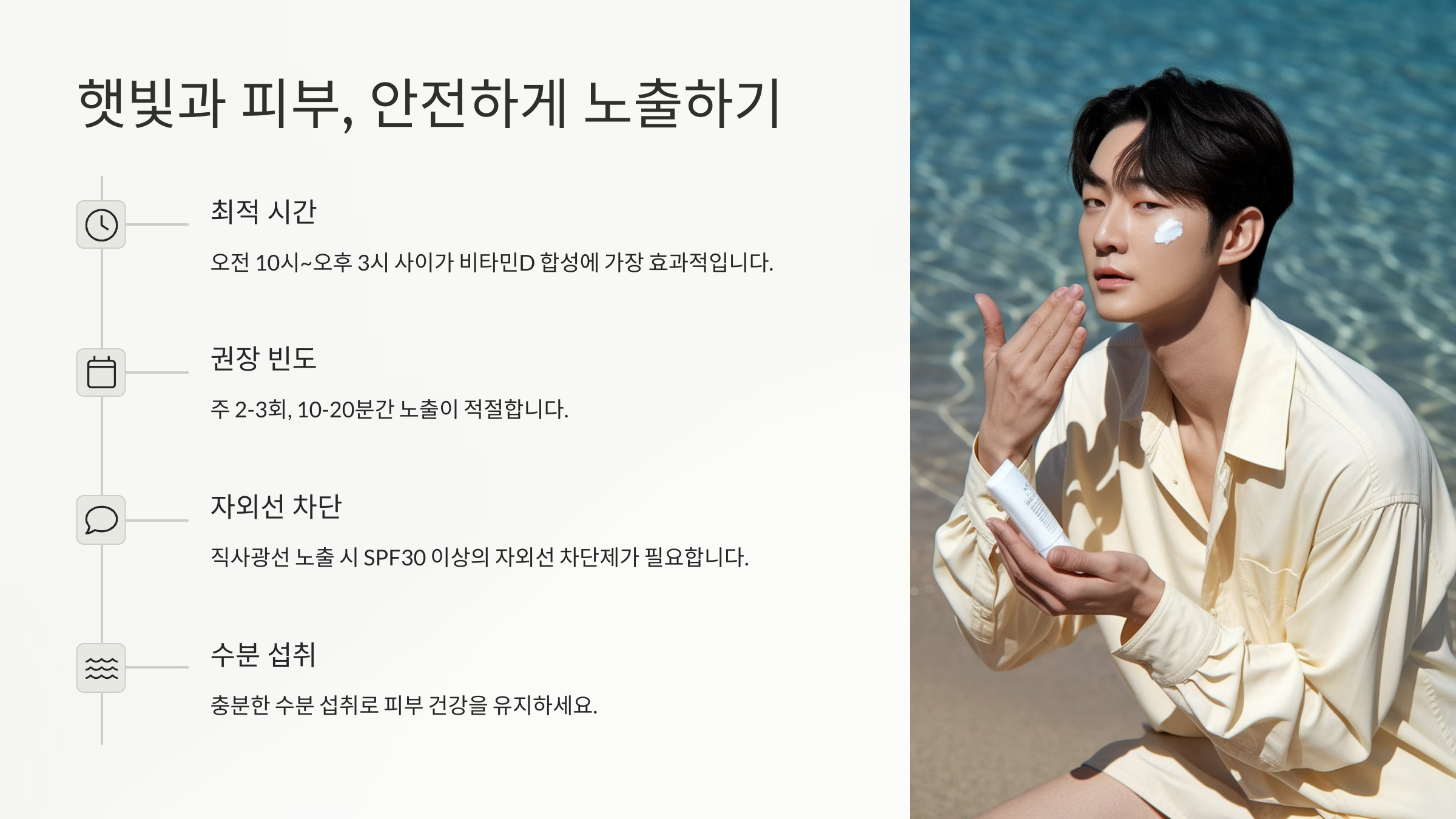팔뚝이나 손등처럼 자극이 덜한 부위를 15~30분 정도 노출시키면 충분하고, 이후 외출할 땐 자외선 차단제를 꼭 발라줘야 해요. 모자나 양산을 쓰는 것도 도움이 돼요. 햇빛과 피부는 적절한 거리두기가 필요해요 😊