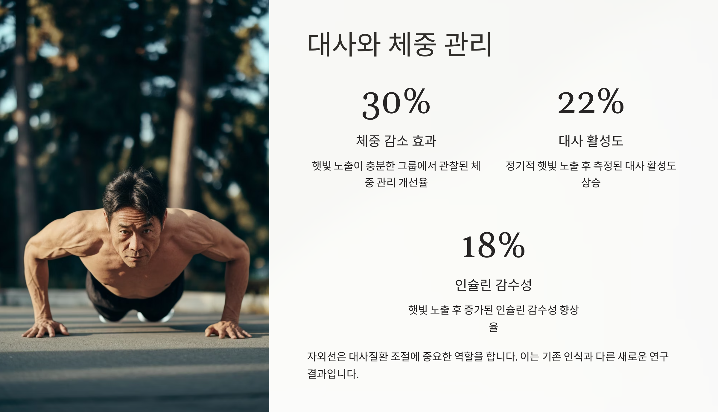 또한 햇빛은 운동 욕구에도 긍정적 자극을 줘요. 아침에 햇빛을 받으며 걷기 시작하면 몸이 가벼워지고, 움직이고 싶은 에너지가 자연스럽게 올라오죠. 체중 조절에는 운동, 식사, 수면, 그리고 햇빛까지 네 박자가 중요하다는 사실, 기억해요!