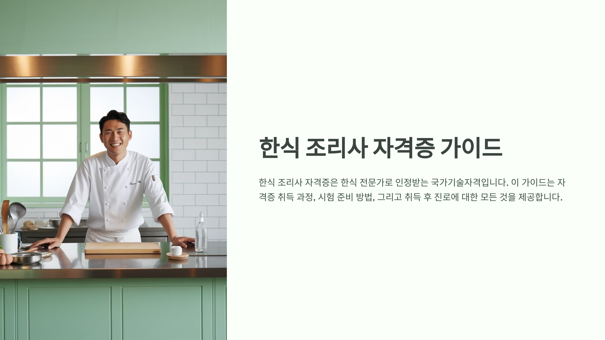 한식 조리사 자격증은 한국 전통 요리를 조리할 수 있는 능력을 검증하는 국가공인 자격증이에요. 이 자격증을 취득하면 전문 조리사로서 식당, 호텔, 급식소 등에서 근무할 수 있어요. 또한, 자격증을 활용해 개인 요식업 창업도 가능하죠.