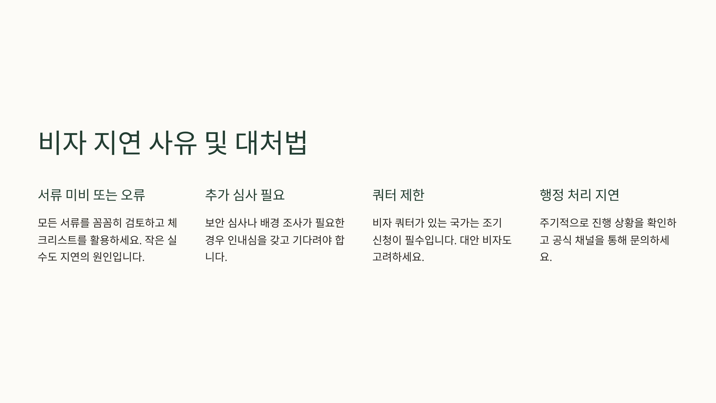 그렇다면 비자 지연을 방지하거나, 이미 늦어진 경우 어떻게 대처하면 좋을까요? 아래 표에서 자세히 알아볼게요. 📌
