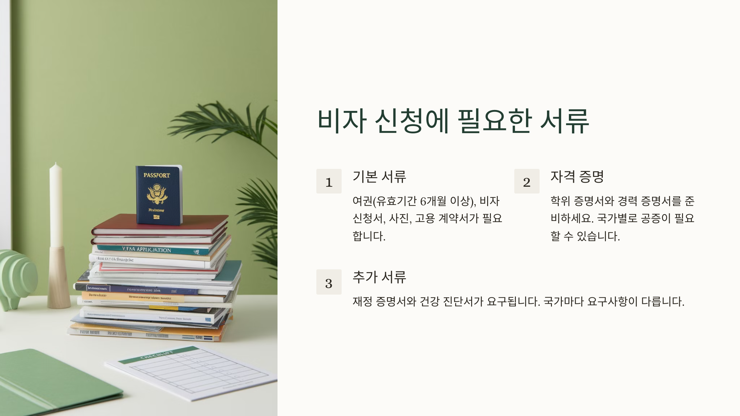 취업 비자를 신청하려면 다양한 서류가 필요해요. 국가마다 다르지만 기본적으로 신분증, 고용 계약서, 학위 증명서, 재정 증빙 자료 등이 포함되죠. 서류가 하나라도 빠지면 심사가 지연될 수 있으니 꼼꼼하게 준비해야 해요. 📌