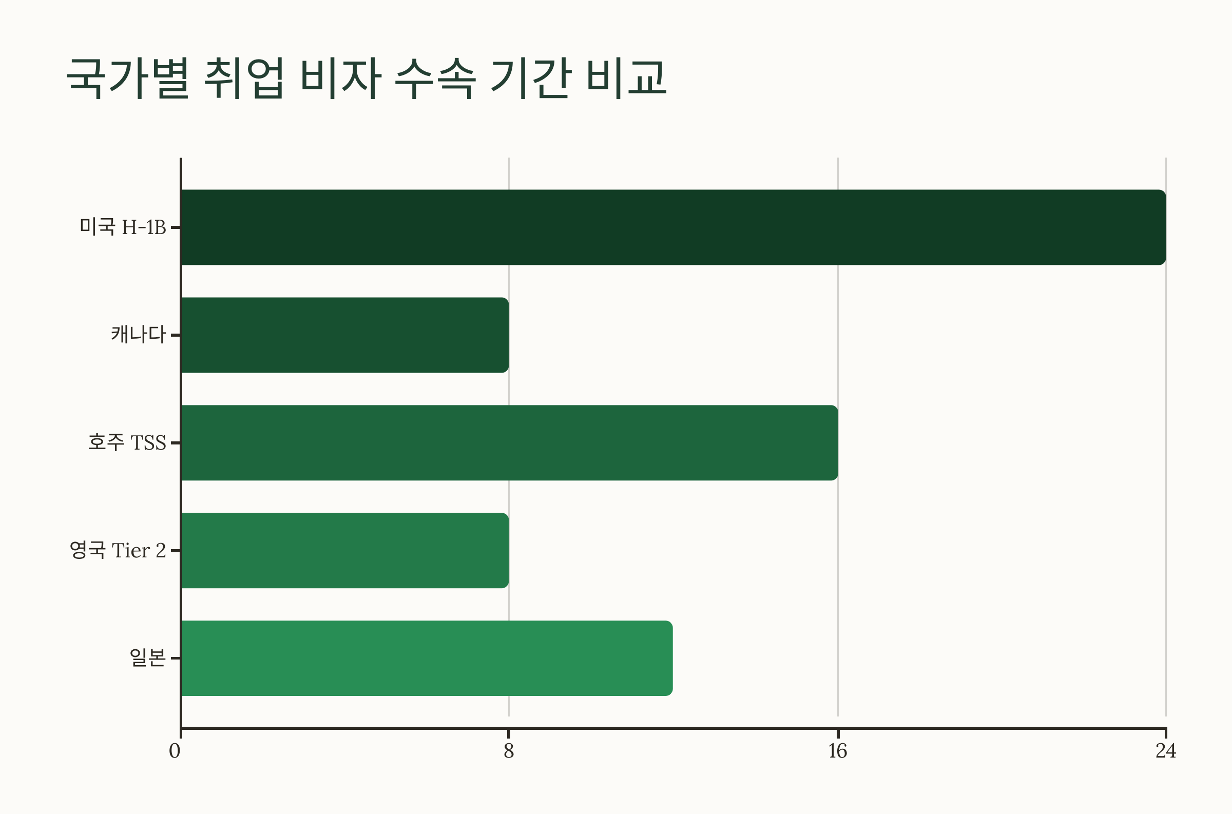 비자 수속이 빠른 국가는 독일과 호주예요. 독일 블루카드는 빠르면 한 달 이내에 승인될 수 있고, 호주의 482 TSS 비자도 1~3개월 내에 완료되는 경우가 많아요.