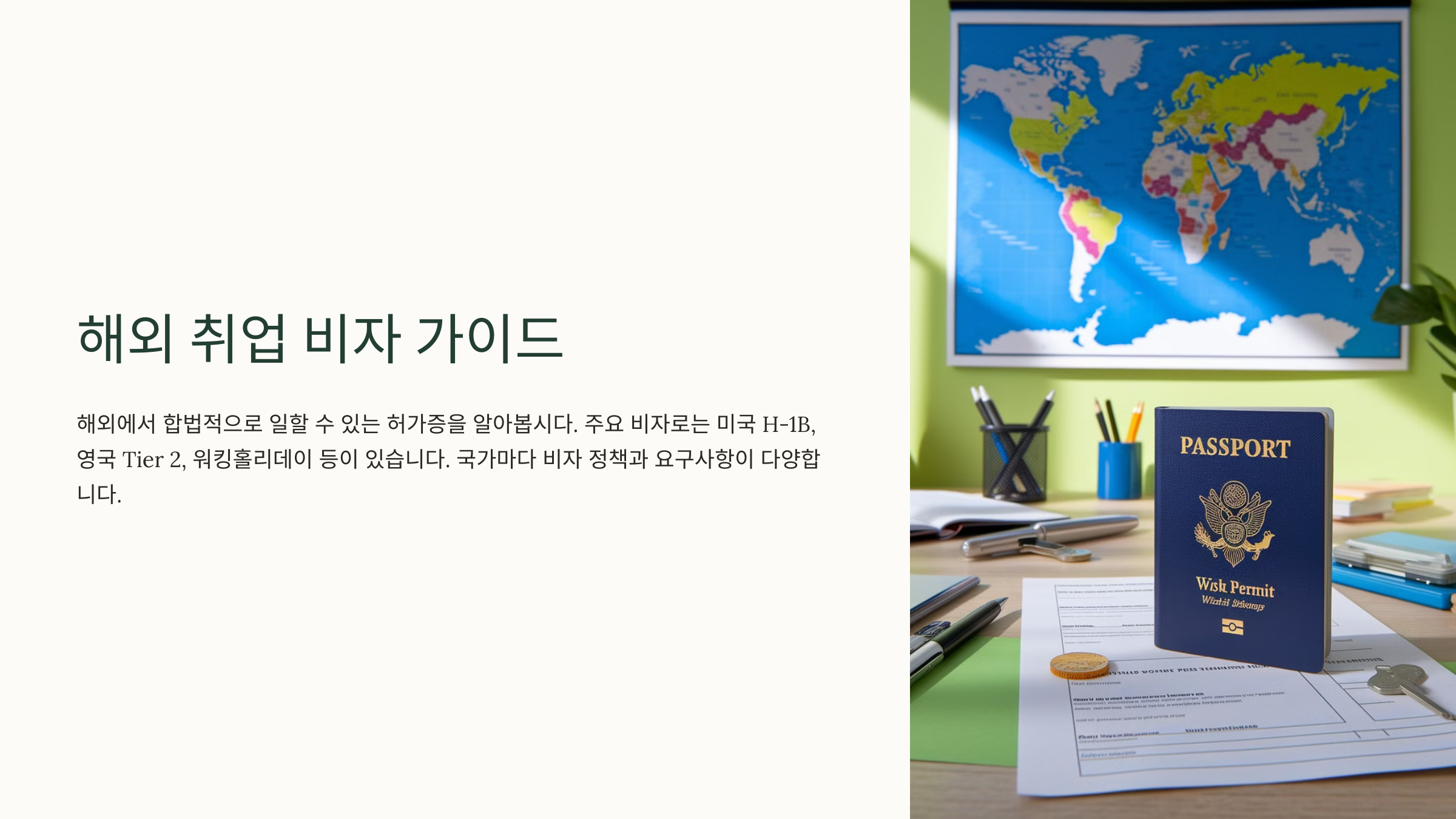 각국의 취업 비자는 자격 요건이 다르기 때문에 자신에게 맞는 비자를 찾는 것이 중요해요. 원하는 나라의 비자 정책을 미리 확인하고 준비하는 것이 가장 좋아요. 😊