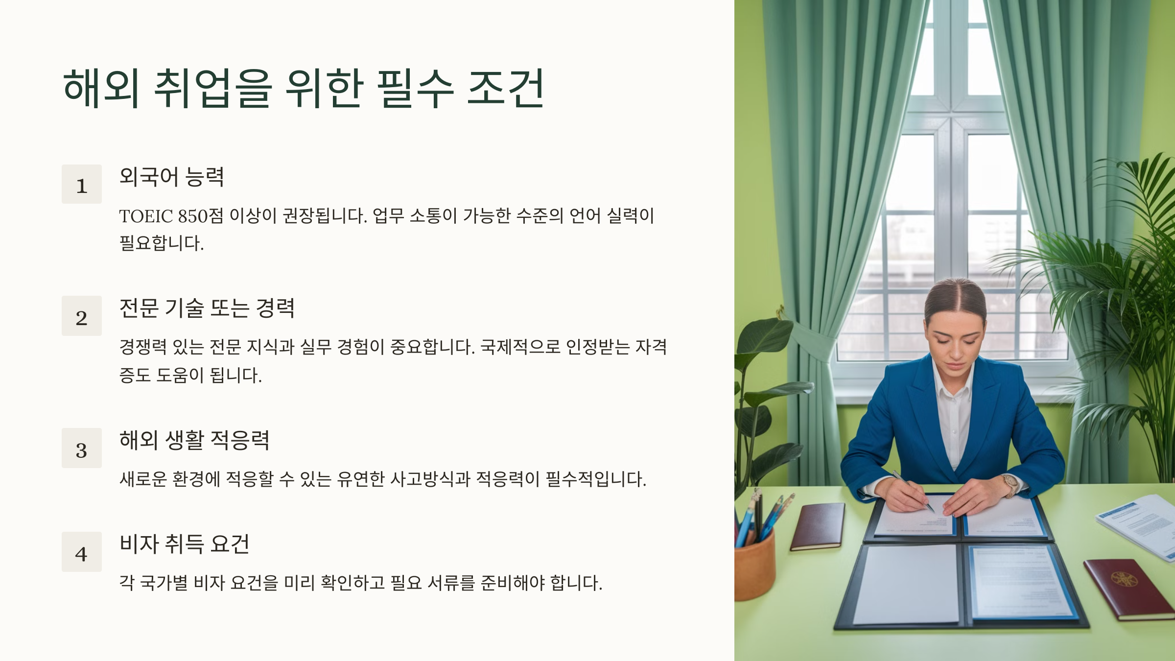 해외 취업을 성공적으로 하려면 몇 가지 중요한 조건을 갖춰야 해요. 언어 능력부터 비자 준비, 경력과 스펙까지 꼼꼼하게 준비해야 해요! ✅