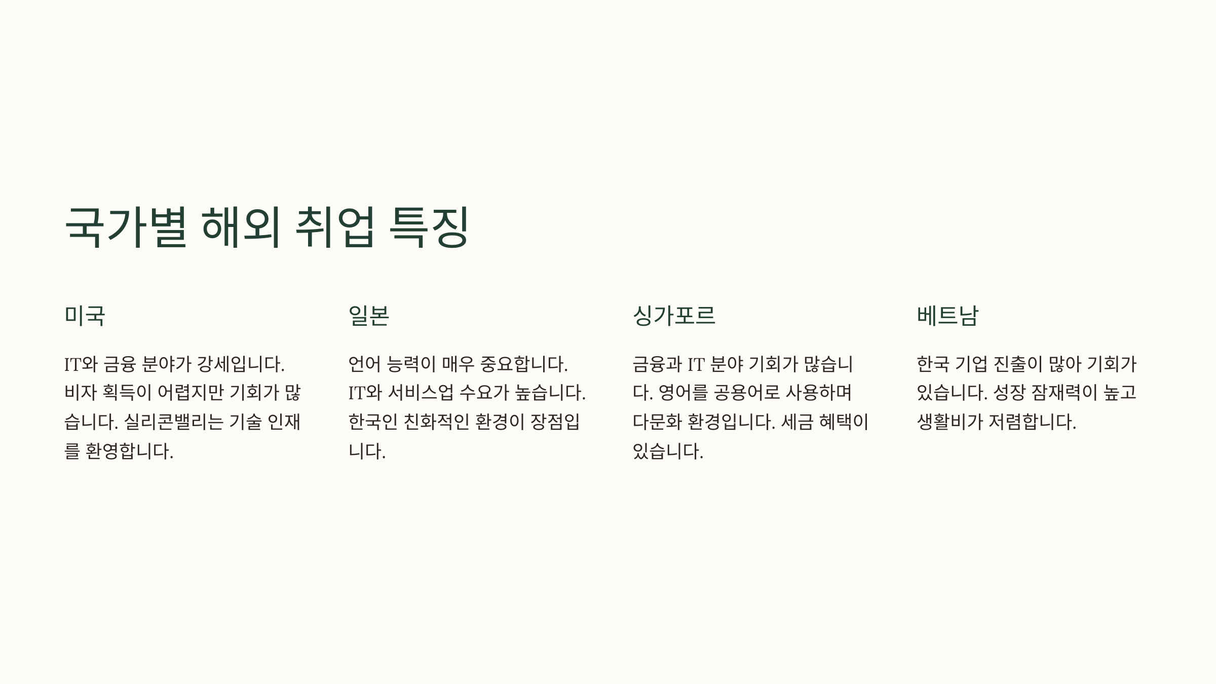 | 미국 | IT, 금융, 헬스케어 | H-1B | 높은 연봉, 경쟁 치열 |