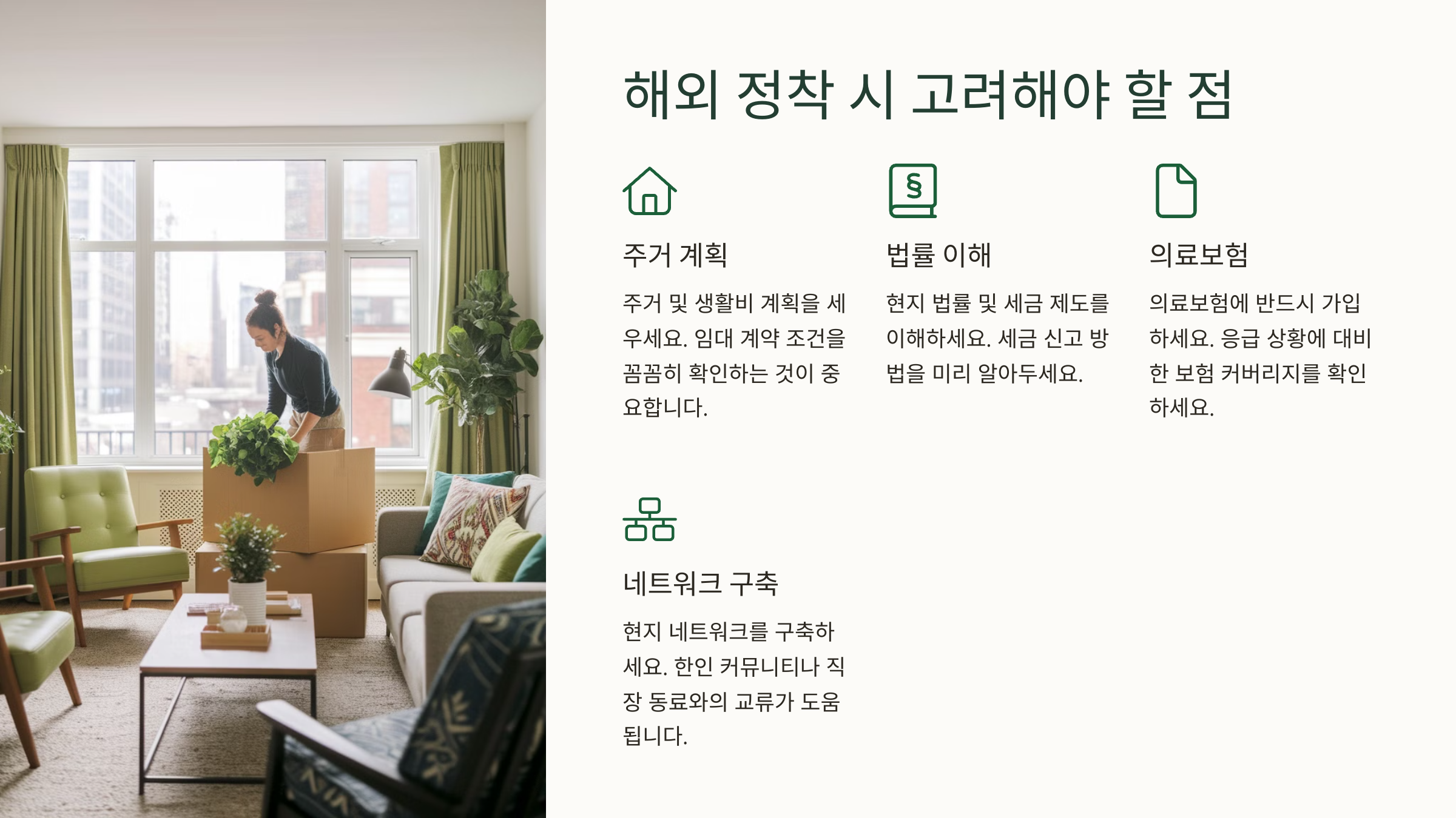 해외에서 성공적으로 정착하려면 미리 철저히 준비하는 것이 중요해요! 🏡✨