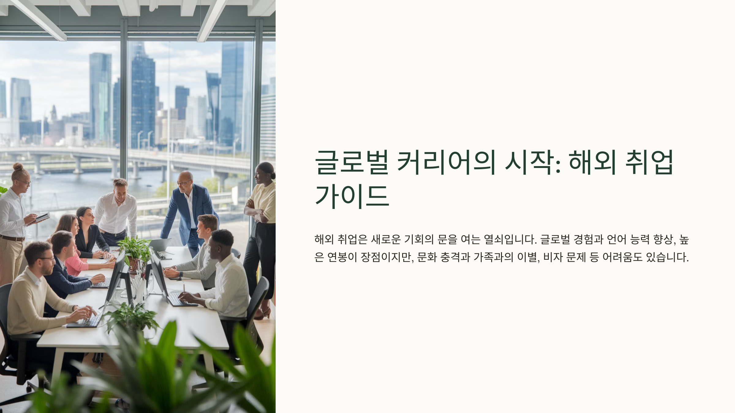 해외 취업은 더 넓은 세계에서 기회를 찾고, 다양한 문화 속에서 일하며, 더 높은 연봉을 기대할 수 있는 매력적인 선택이에요. 하지만 준비 없이 도전하면 예상치 못한 어려움을 겪을 수도 있어요.