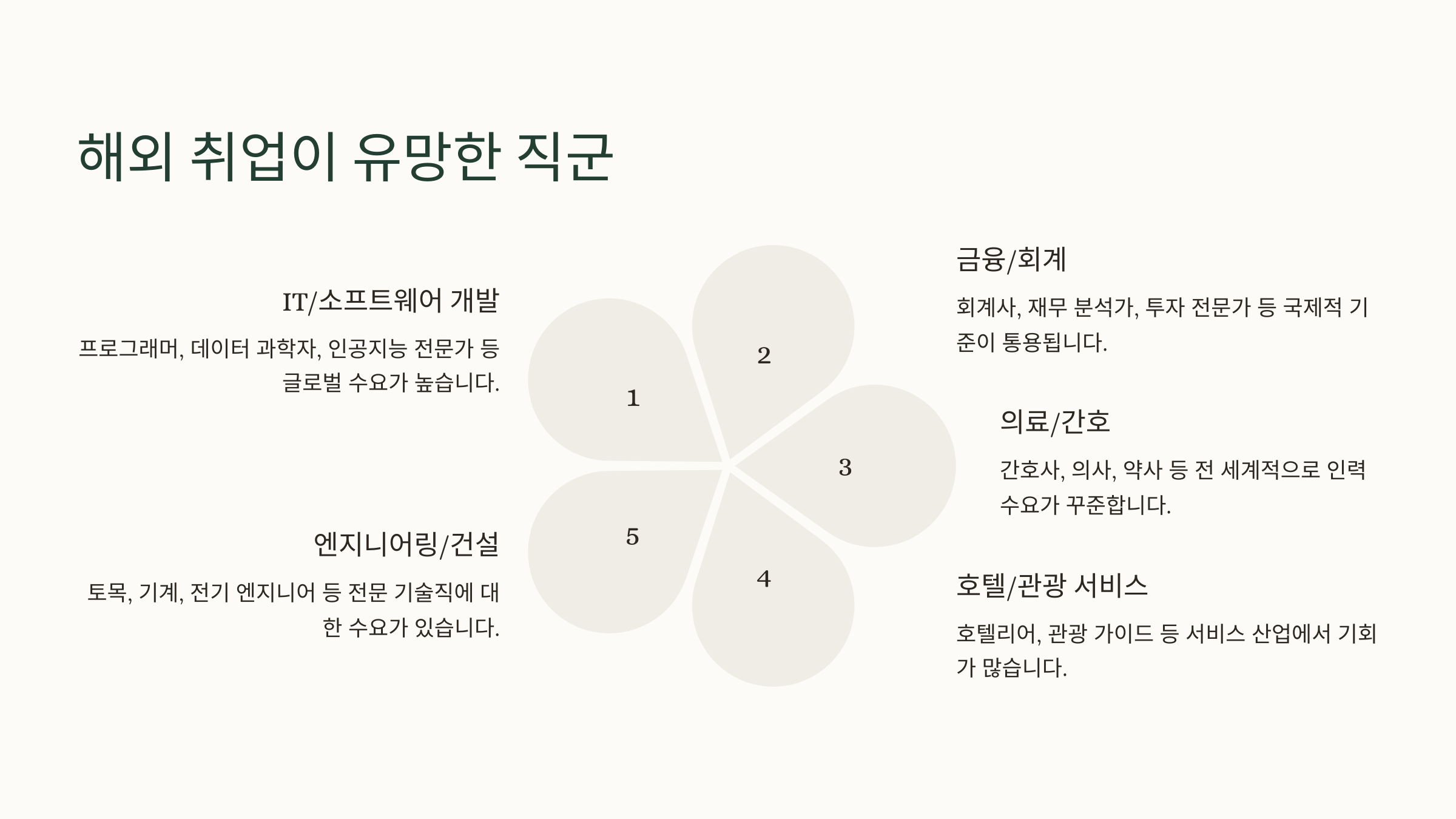 해외에서는 특정 직군이 더욱 유망해요. 특히 IT, 헬스케어, 엔지니어링, 금융 등은 꾸준히 수요가 높은 분야예요! 💼✨