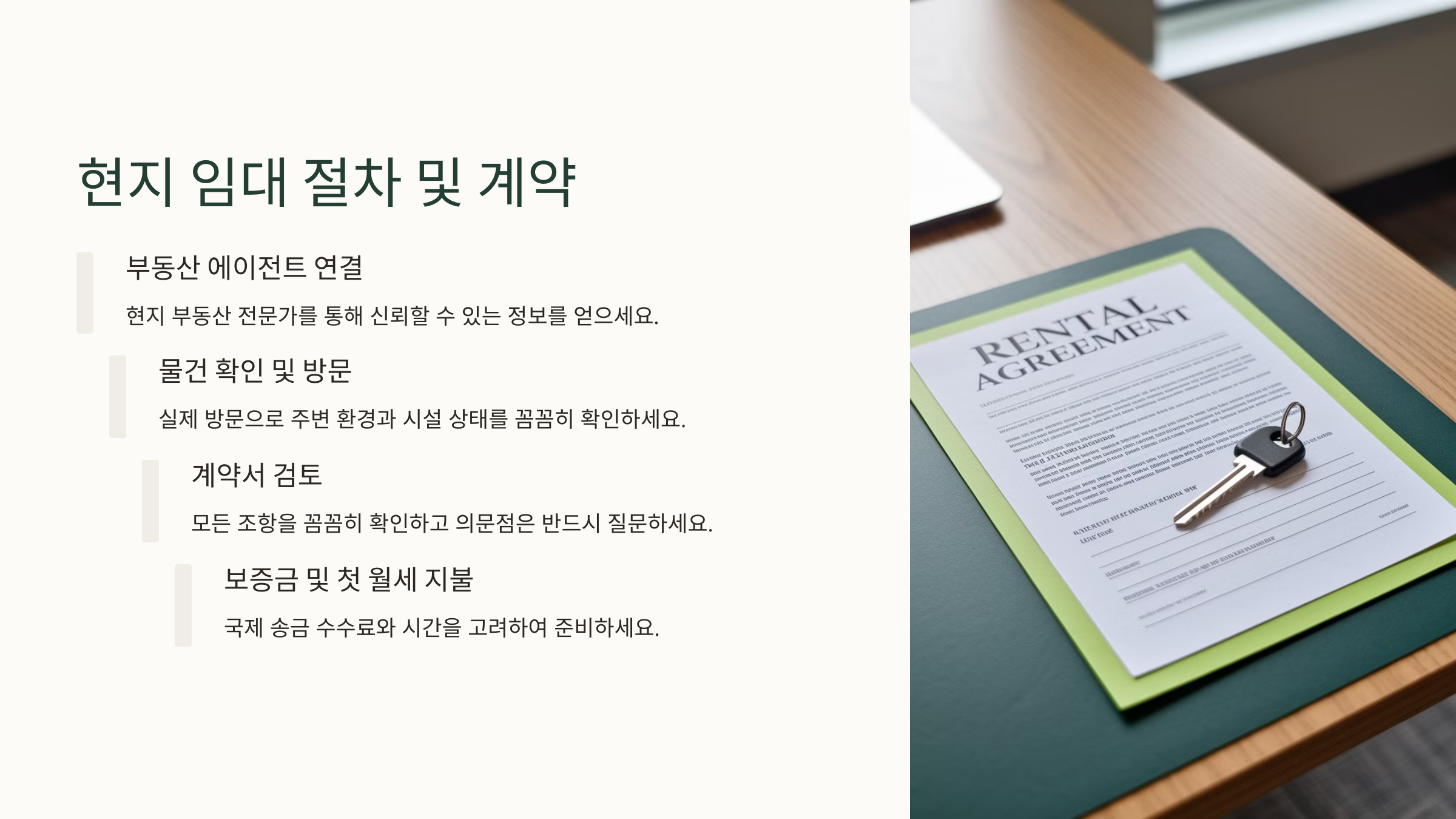 각 국가의 임대 절차와 계약 방식이 다르므로, 계약 전에 반드시 꼼꼼히 확인하고 자신에게 맞는 방식을 선택하는 것이 중요해요! 🧐