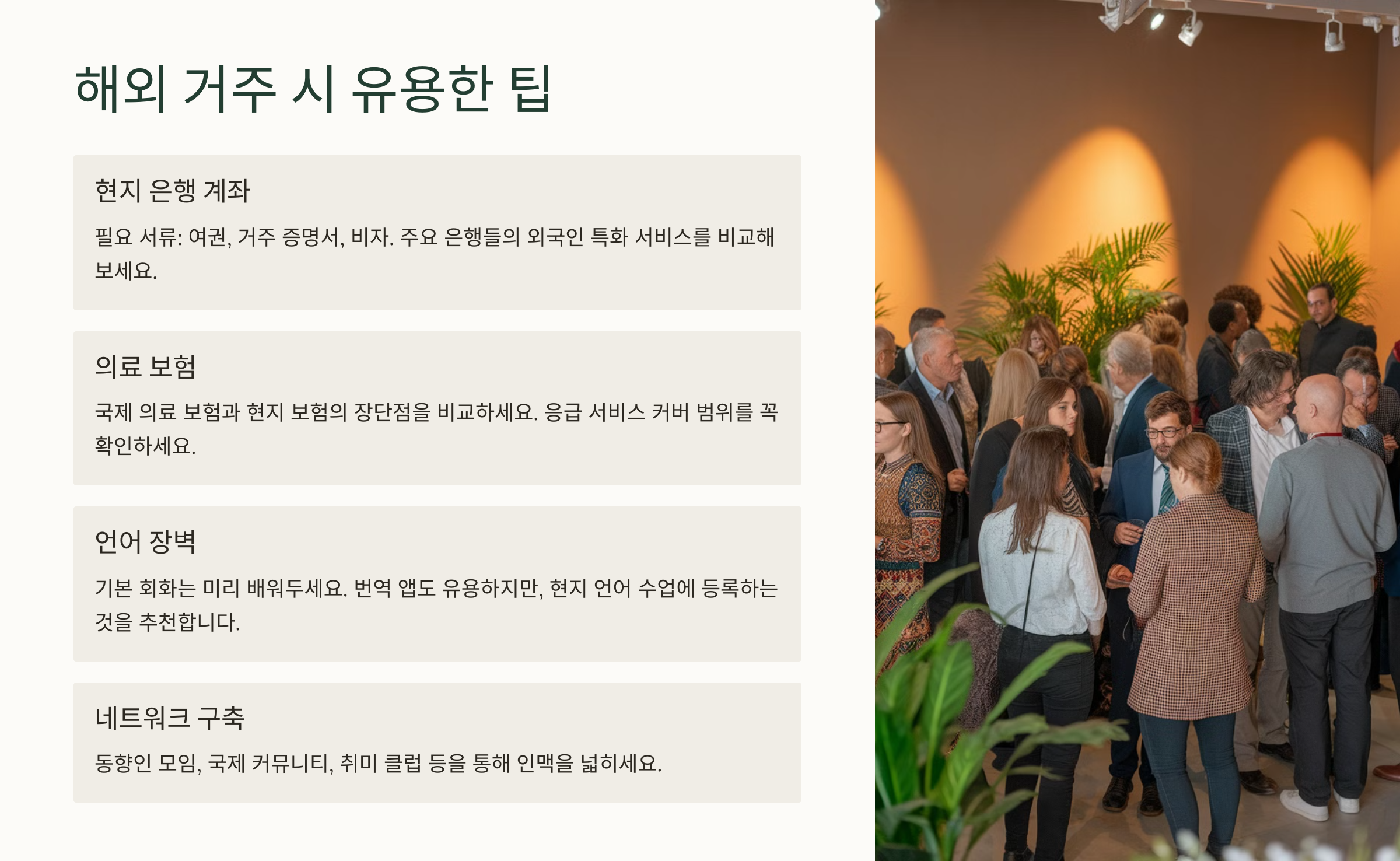해외에서 생활할 때는 단순히 거주지 찾기뿐만 아니라, 적응하는 과정도 매우 중요해요. 특히, 문화 차이와 행정 절차 등을 미리 숙지하면 훨씬 수월하게 적응할 수 있어요. 🌍