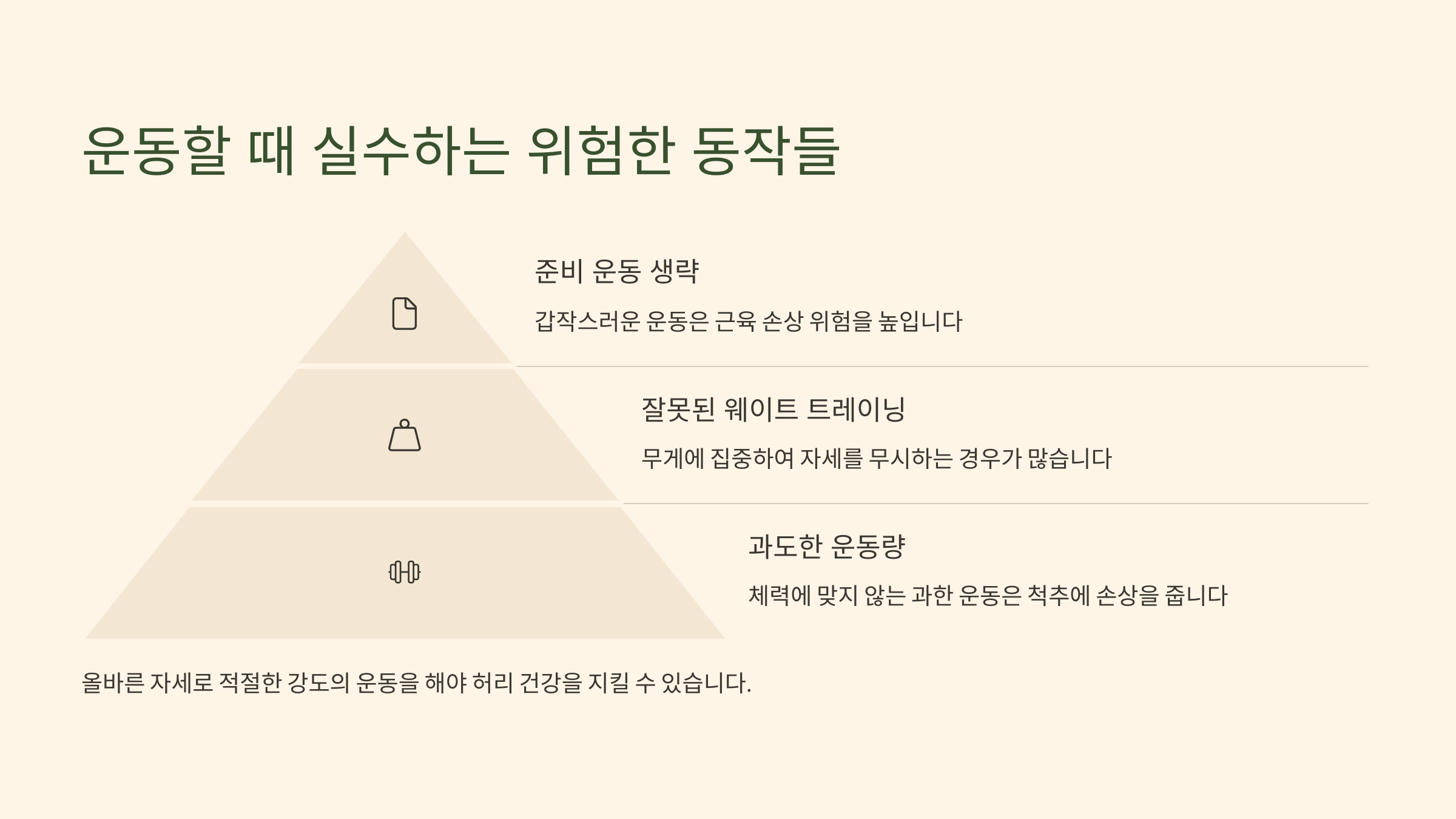운동 전에는 반드시 스트레칭으로 근육을 풀고, 허리 주변 코어 근육을 강화하는 동작을 우선적으로 하는 것이 좋아요.