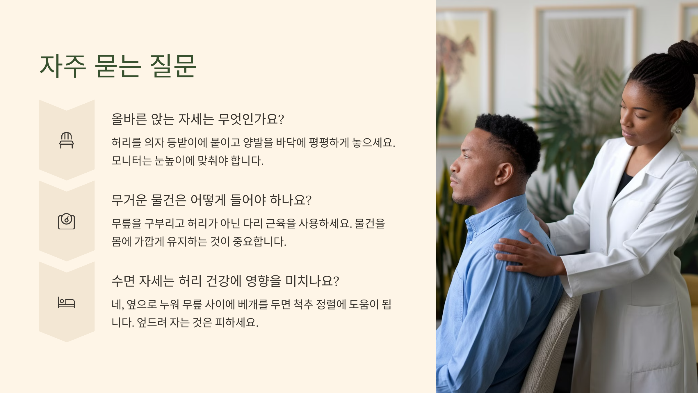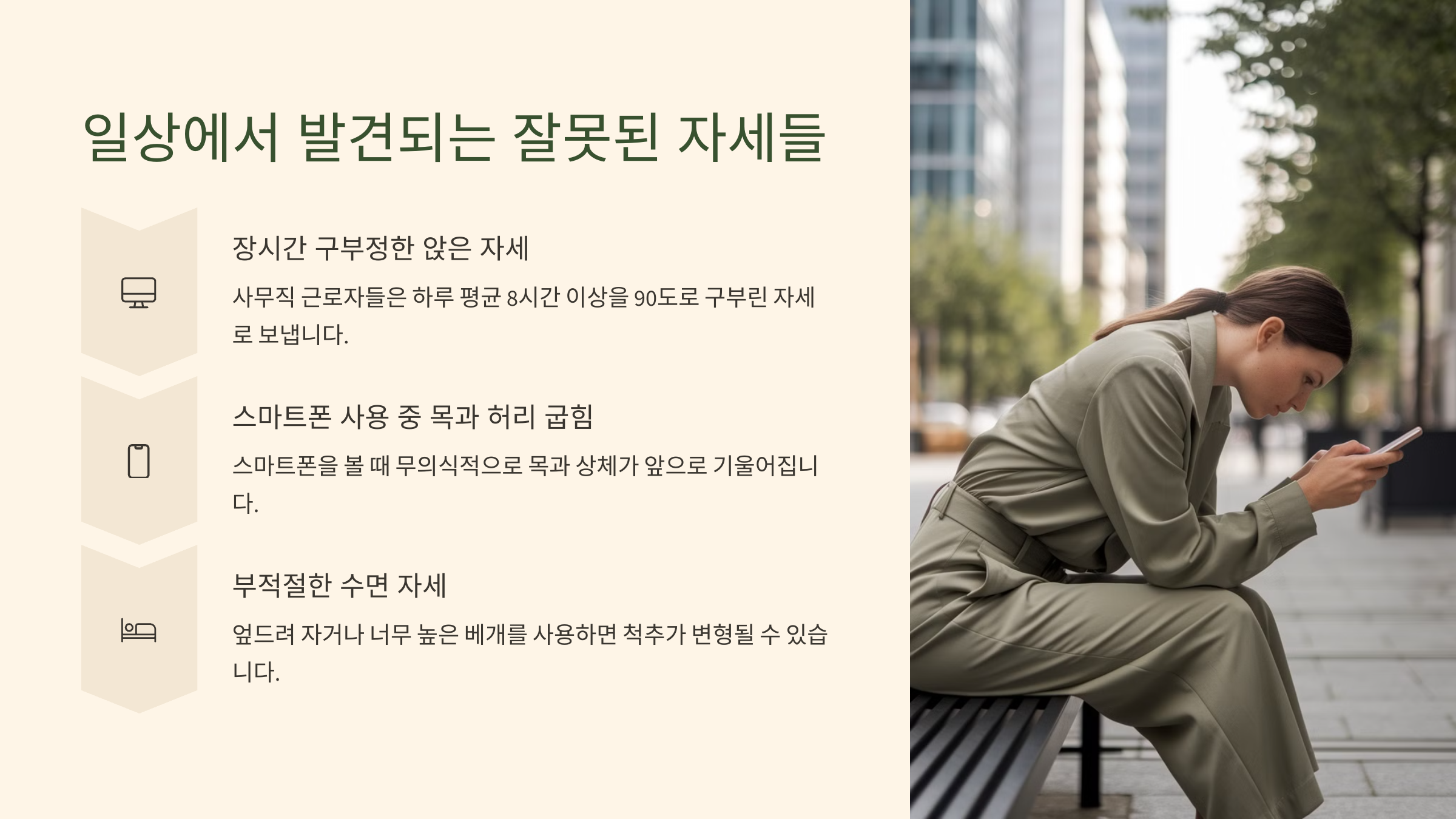 일상 속에서 습관처럼 하는 행동이지만, 허리에 나쁜 영향을 준다는 걸 자각하고 바꾸는 게 첫 걸음이에요.