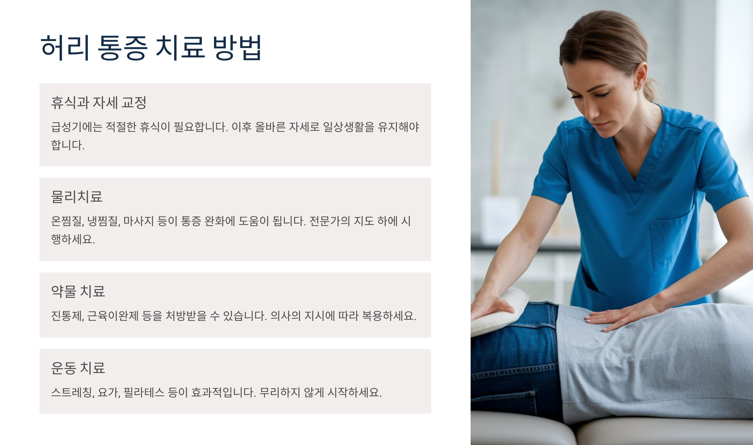 허리 통증 치료는 원인에 따라 달라져요. 일반적인 근육통은 휴식, 온찜질, 스트레칭 등으로 빠르게 회복될 수 있지만, 만성 통증이나 디스크성 통증은 전문적인 치료가 필요해요.