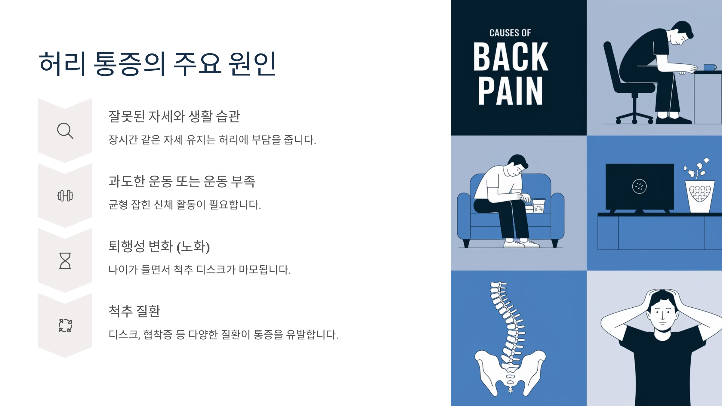 허리 통증을 유발하는 원인은 매우 다양해요. 가장 흔한 원인은 바로 잘못된 자세예요. 특히 오래 앉아 있는 생활, 고개를 숙이는 자세, 다리 꼬기, 구부정한 자세 등은 허리에 큰 부담을 주죠.