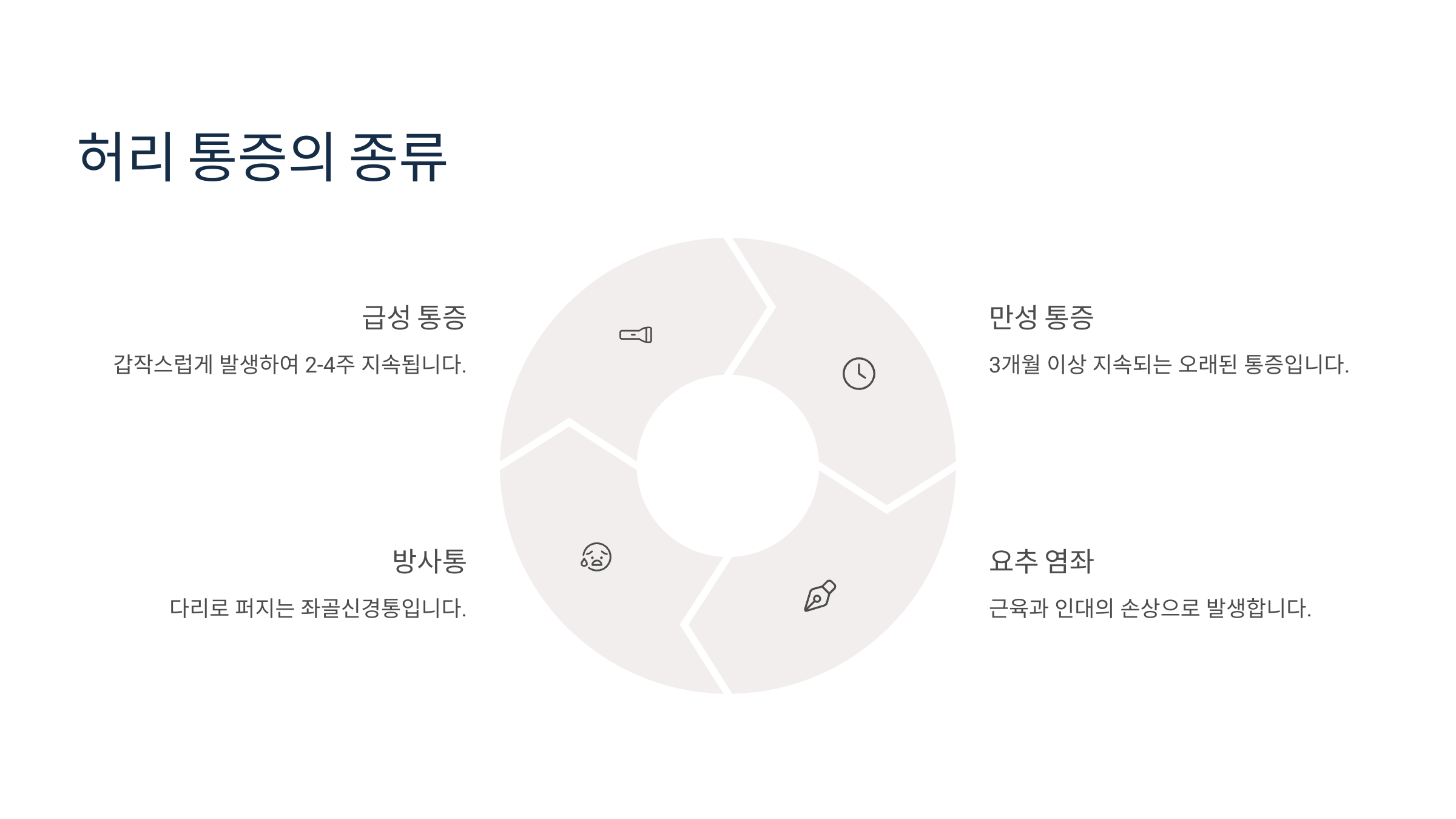 허리 통증은 '급성'과 '만성'으로 나눌 수 있어요. 급성은 갑작스러운 움직임, 무거운 물건 들기, 삐끗함 등으로 6주 이내에 발생하는 통증이고, 만성은 3개월 이상 지속되며 일상생활에 영향을 미치는 통증이에요.