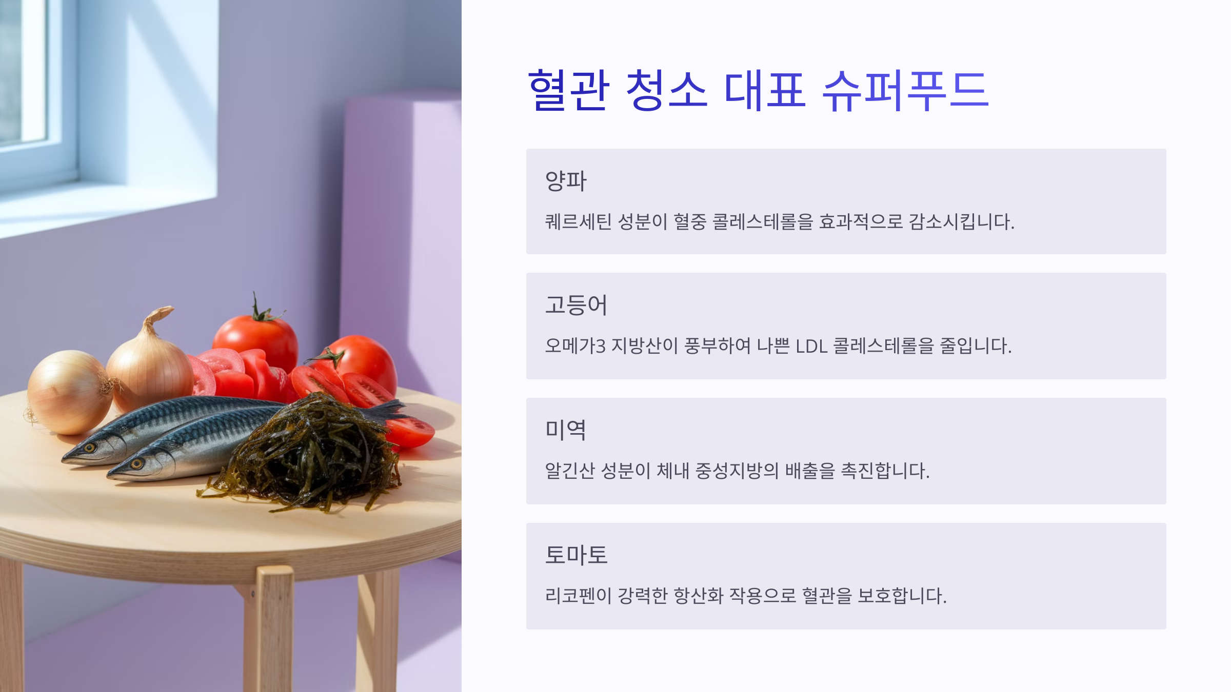 혈관 청소 음식은 따로 챙기기보단, 평소 식단에 자연스럽게 넣는 게 좋아요.