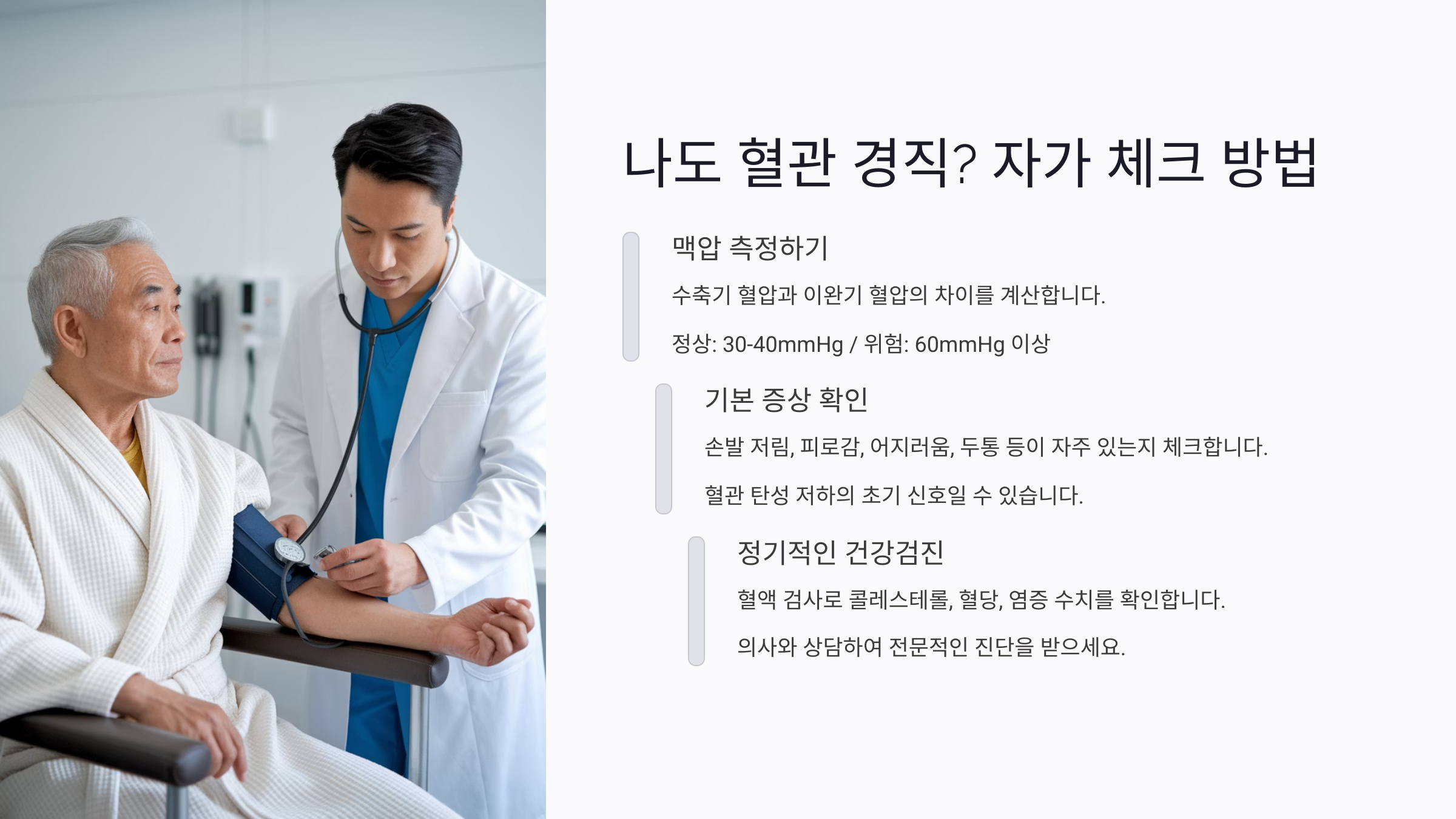 혈관 탄성은 병원에서 정밀 측정을 해야 정확하긴 하지만, 일상 속에서도 몇 가지 신호를 통해 혈관 경직 가능성을 체크해볼 수 있어요. 특별한 장비 없이도 나의 상태를 의심해볼 수 있는 간단한 방법들이 있죠.