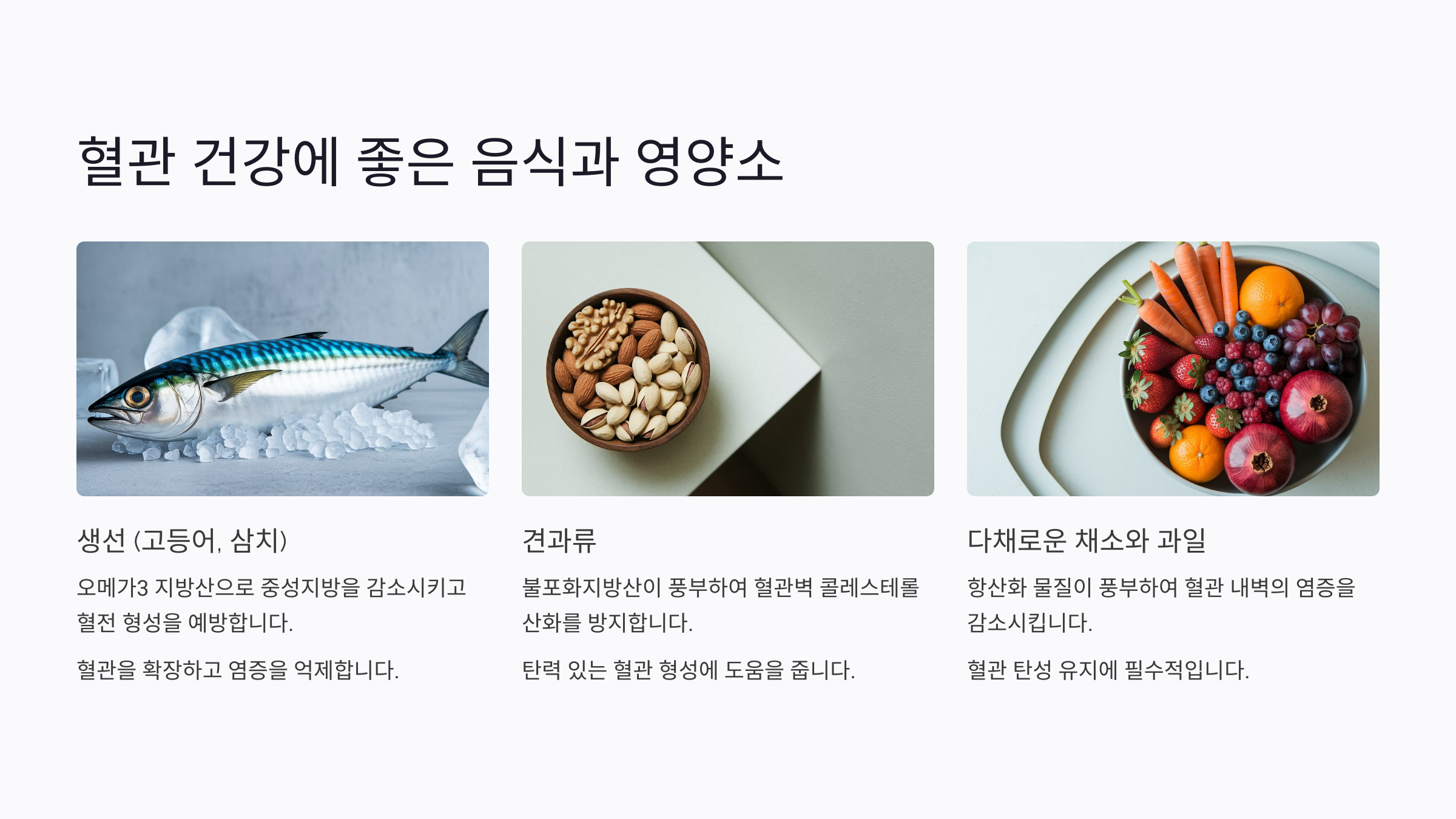 | 항산화 식품 | 베리류, 토마토, 녹차 | 염증 억제, 혈관 보호 |