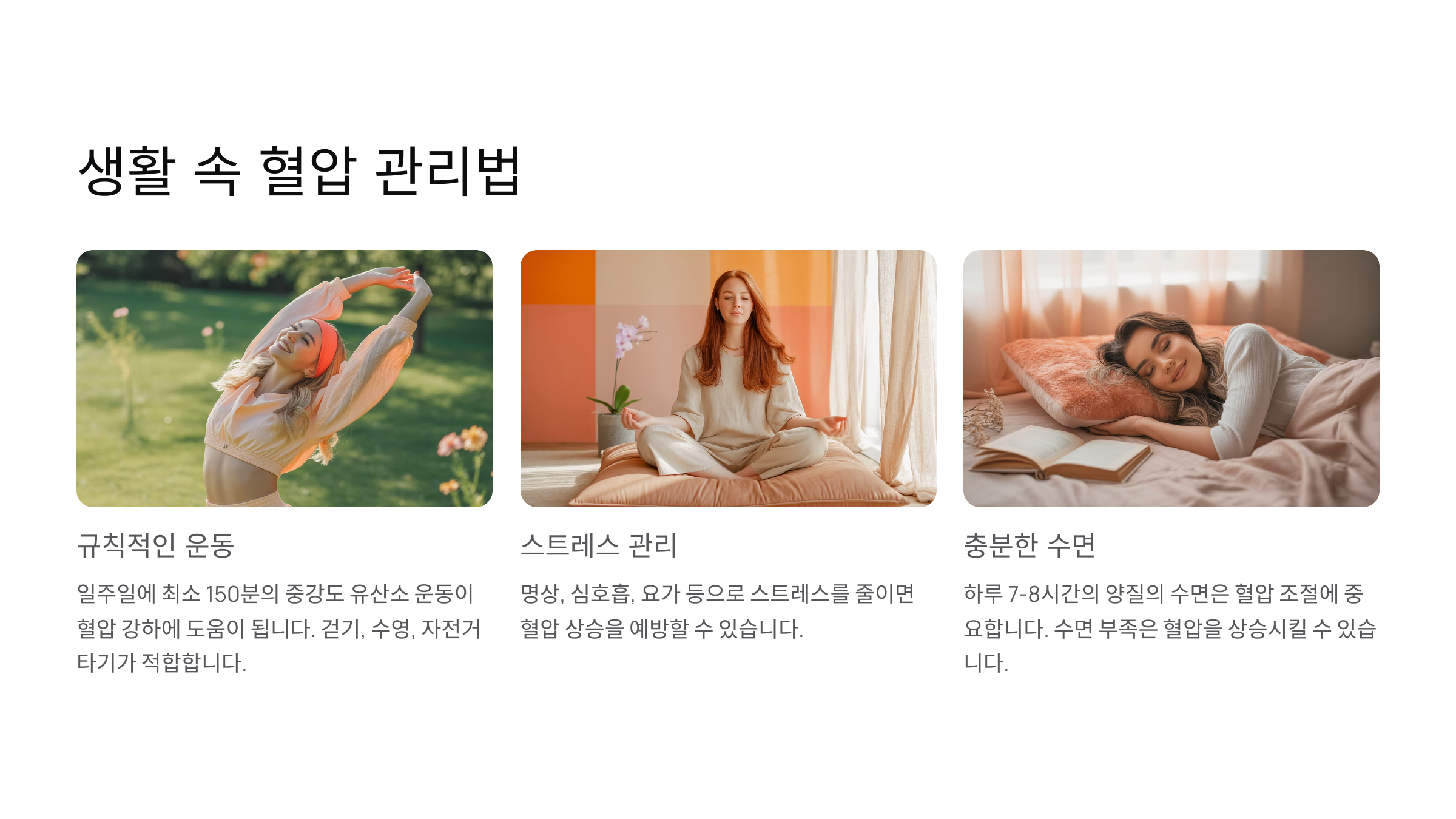 가공식품 줄이기, 저염식 실천, 스트레칭 등도 실천하기 쉬우면서 꾸준히 하면 결과가 분명히 나타나는 습관들이에요. 특히 음악 감상, 아로마 테라피 같은 이완 요법도 혈압 감소에 과학적으로 입증된 바 있어요.