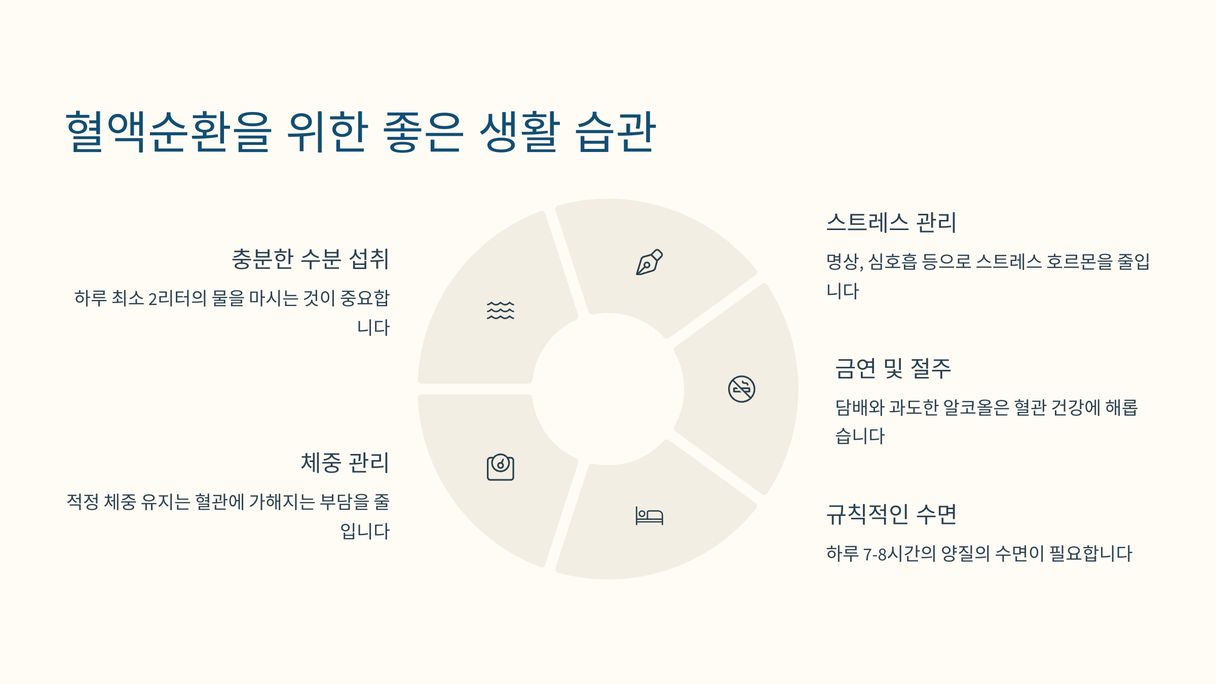 흡연과 과도한 음주는 혈관을 수축시키고 혈액을 끈적하게 만들기 때문에 순환을 방해해요. 스트레스를 줄이고 수면의 질을 높이는 것도 중요한 포인트예요.