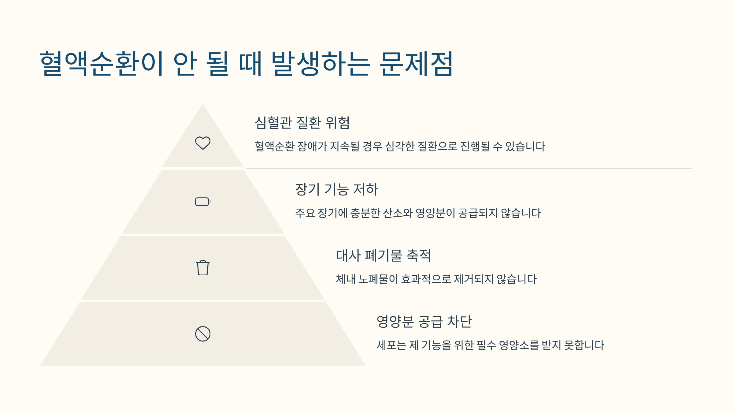 하지만 스트레스, 운동 부족, 고지방 식단, 잘못된 자세 등이 순환을 방해하면서 피로, 무기력, 통증, 저림 등의 증상이 생길 수 있어요.