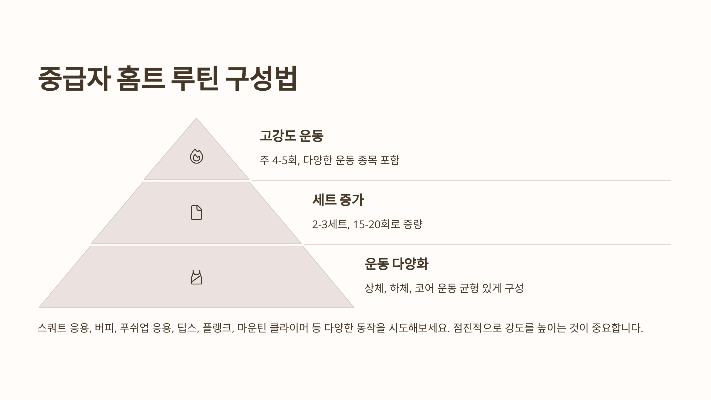 홈트를 어느 정도 해본 분들이라면, 더 자극 있는 루틴이 필요해요. 중급자는 주 4~6회 운동을 목표로 하고, 각 부위별로 나누어 근육을 집중 공략하는 분할 루틴이 효과적이에요. 이 단계부터는 근력운동 비중을 늘리는 것이 좋아요.