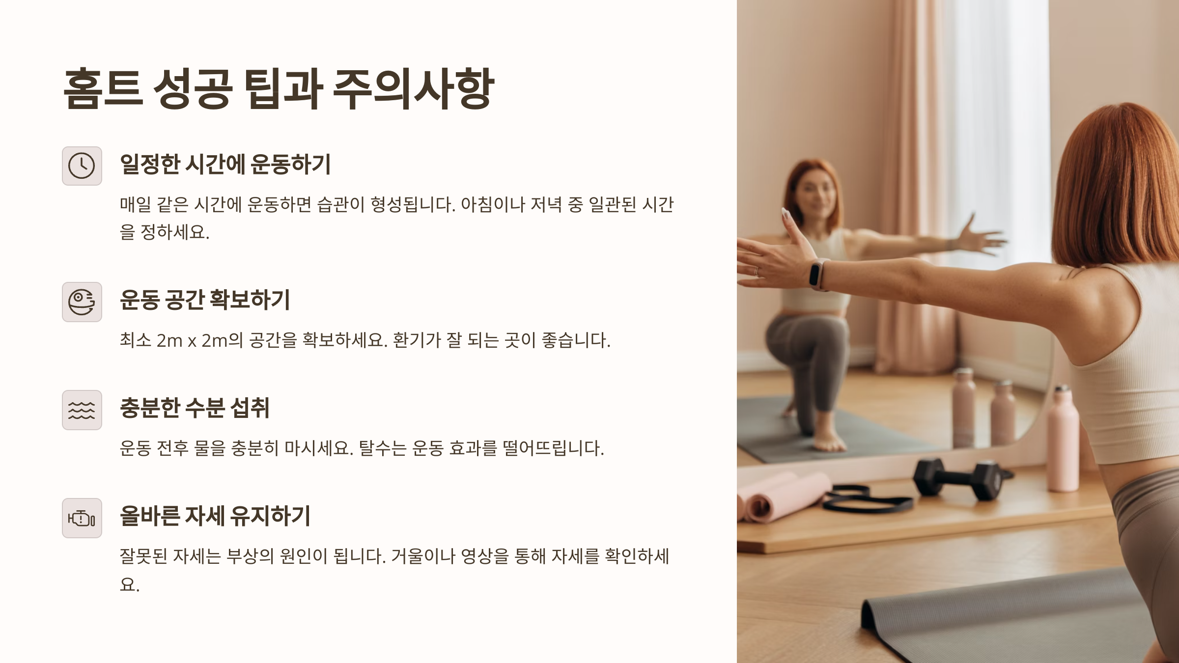 이제 막 운동을 시작하려는 사람에게 홈트는 최고의 출발점이에요. 비용 부담 없고, 시간 맞춰 이동할 필요도 없고, 내가 편한 시간에 할 수 있다는 점에서 부담 없이 지속 가능한 루틴을 만들 수 있어요. 💪