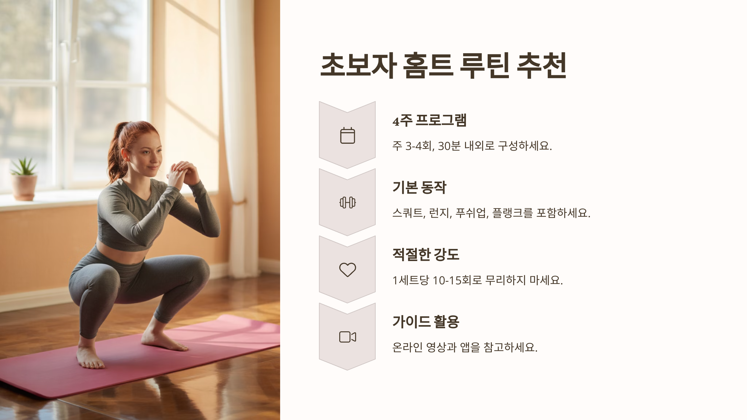 홈트를 처음 시작하는 분이라면 가장 중요한 건 "무리하지 않고 꾸준하게"예요. 시작부터 너무 강도 높은 운동을 하면 근육통 때문에 금방 포기하게 되죠. 그래서 처음 2~4주는 가볍고 전신을 활용하는 루틴이 좋아요.