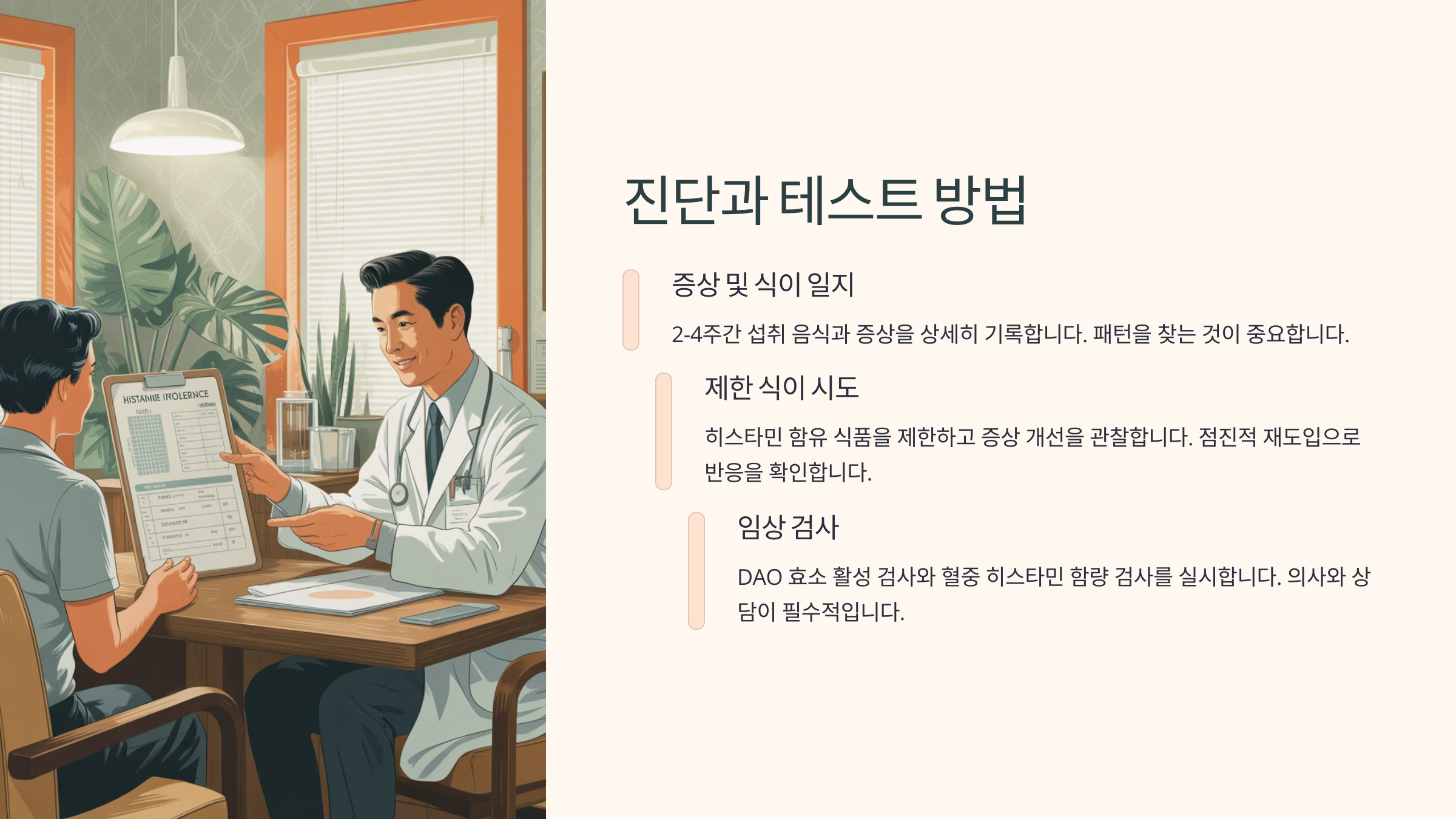 히스타민 불내증은 일반적인 병원 검사로는 쉽게 진단되지 않아요. 알레르기 검사나 혈액 검사에서는 아무 이상이 없다고 나오는 경우가 많기 때문에, 정확한 판단을 위해 여러 가지 단계를 거치는 것이 필요해요. 가장 중요한 건 '증상 + 식사반응 + 배제 테스트'의 조합이에요.