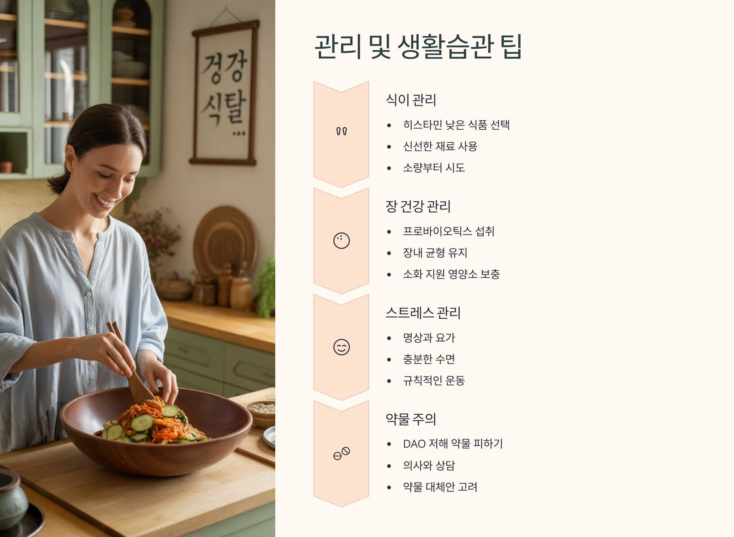 | 보조제 | DAO 효소 보충제, 유산균 | 의사 상담 후 섭취 |