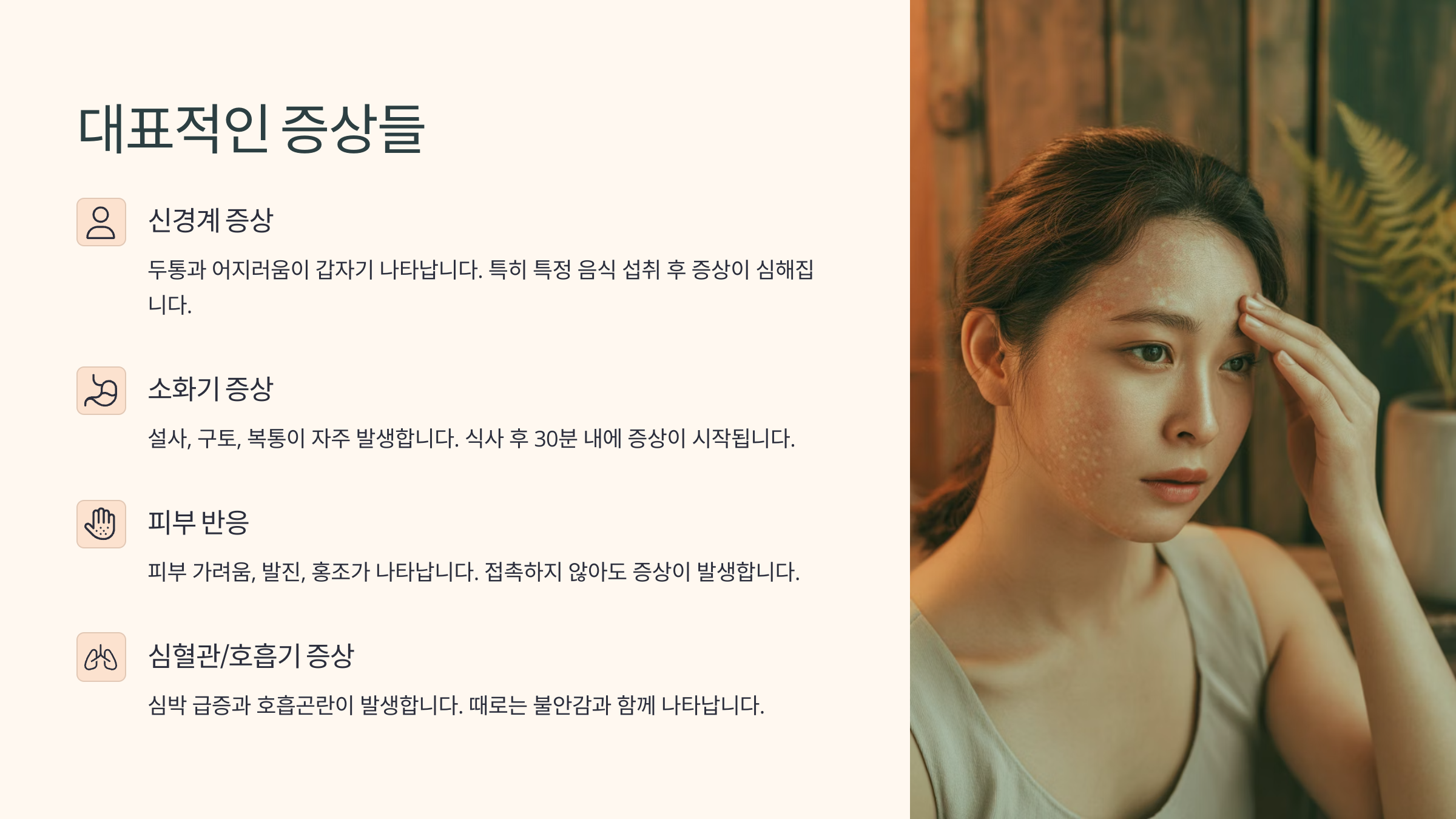 보통 식후 갑자기 얼굴이 붉어지거나, 두통, 콧물, 피부 가려움, 복통 같은 증상이 나타난다면 히스타민 불내증을 의심해볼 수 있어요. 특히 알레르기 검사에서는 아무 문제가 없는데도 이런 반응이 반복된다면 더더욱 가능성이 높답니다.