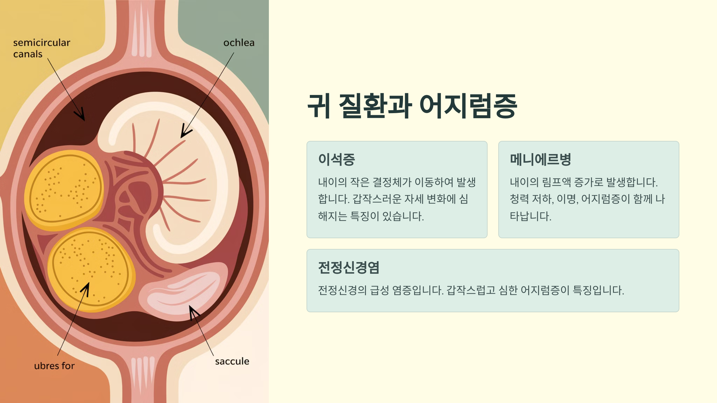 귀는 단순히 소리를 듣는 기관이 아니라, 우리 몸의 균형을 유지하는 중요한 역할도 해요. 특히 내이(inner ear) 속의 전정기관은 움직임을 감지하고 뇌에 신호를 보내 균형을 잡아줘요. 이 전정기관에 이상이 생기면 어지럼증이 유발되는데, 가장 대표적인 예가 '이석증(양성 돌발성 체위성 현훈)'이에요.
