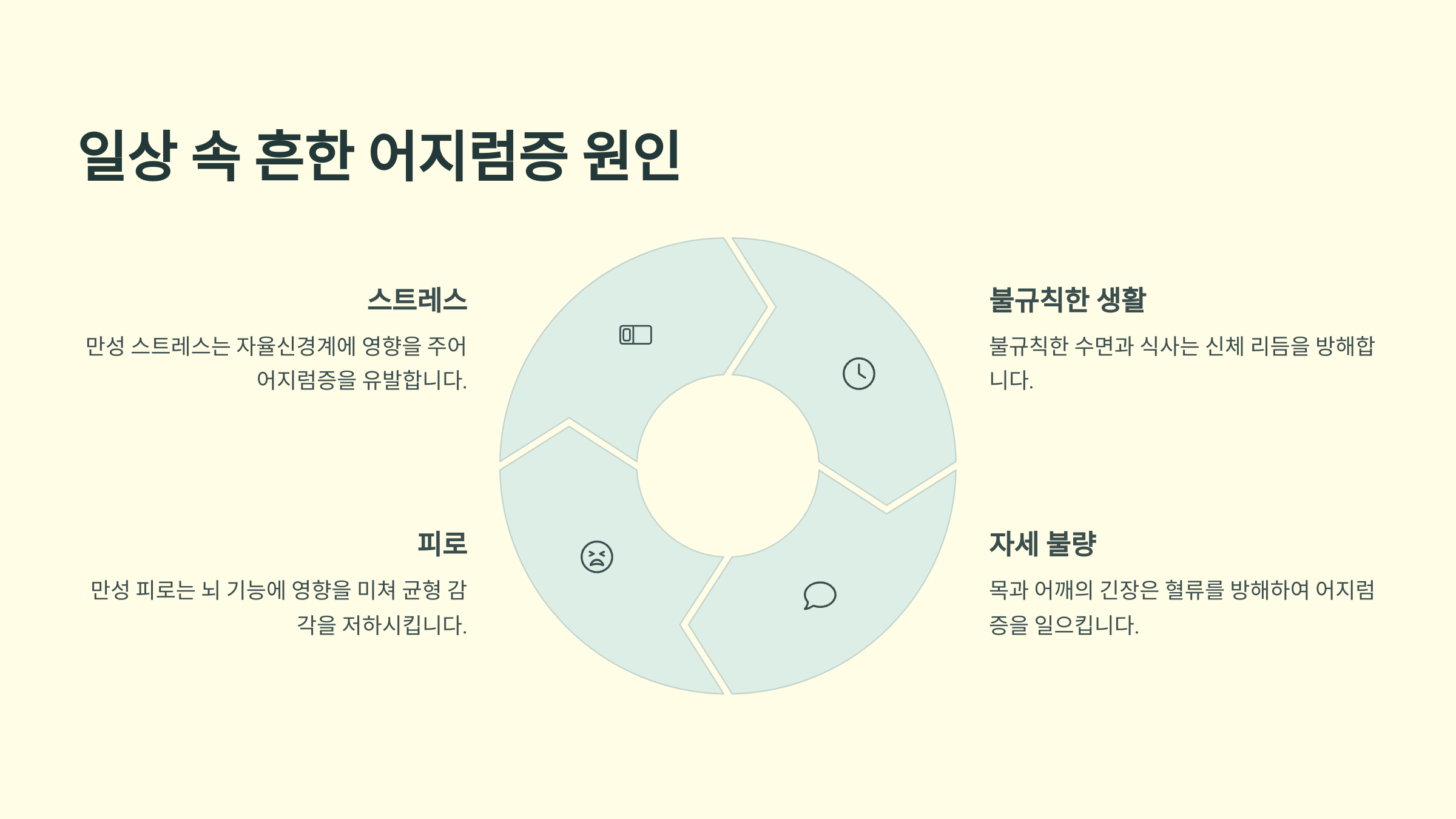 어지럼증은 특정 질환이 없어도 일상생활 속에서 흔히 발생할 수 있어요. 대표적인 예로 탈수, 과로, 스트레스, 수면 부족 등이 있어요. 특히 장시간 앉아 있다가 갑자기 일어설 때 '핑' 도는 느낌은 누구나 한 번쯤 겪어봤을 거예요.