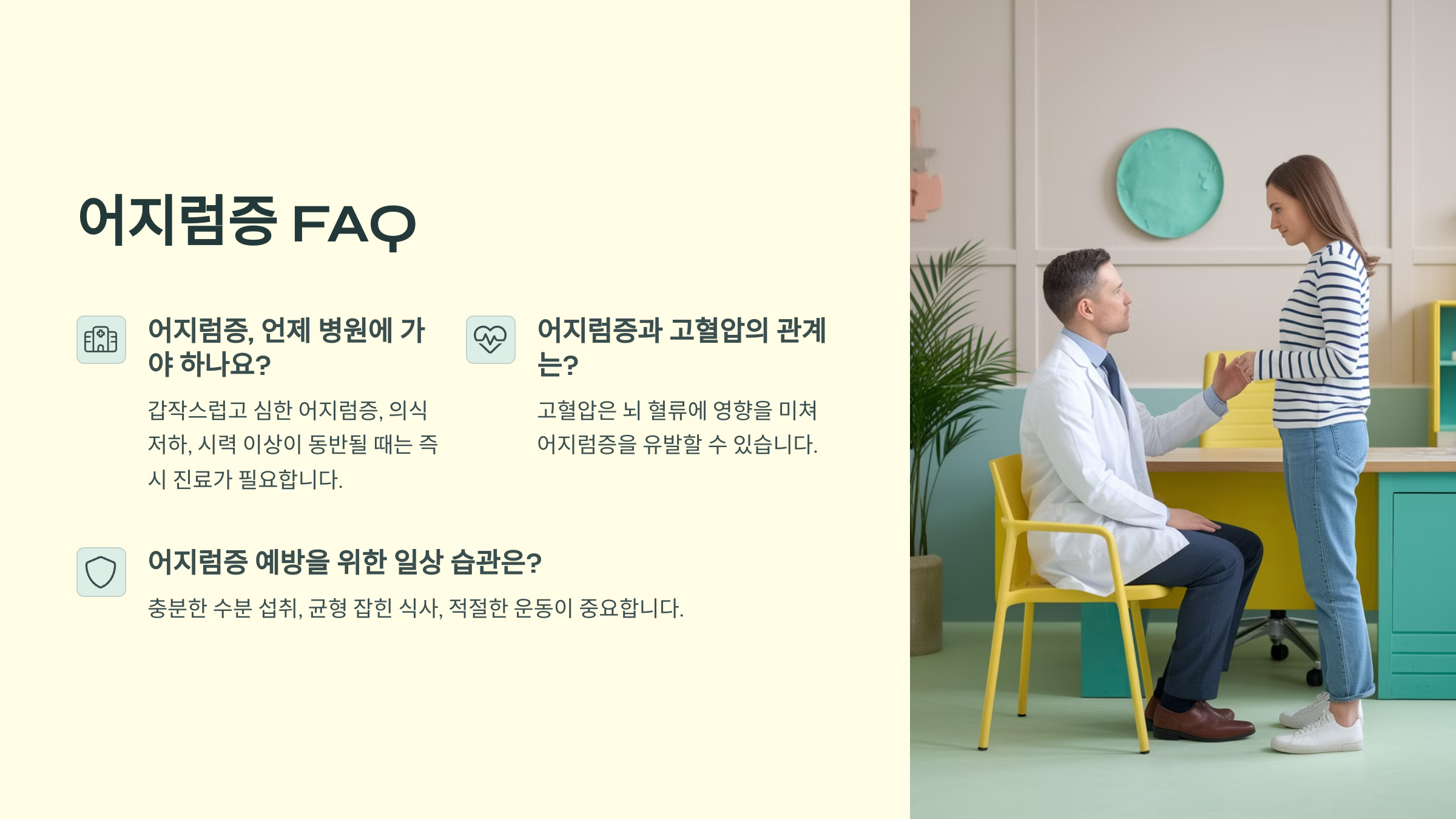 일시적인 피로, 스트레스, 수면 부족 등으로 생길 수도 있지만, 반복되거나 오래 지속된다면 반드시 병원을 방문해서 진료받는 게 좋아요. 특히 일어설 때 순간적으로 어지러움이 심하다면 기립성 저혈압일 수 있고, 갑작스럽게 시야가 돌아가고 구토까지 동반된다면 내이 질환일 수 있어요.