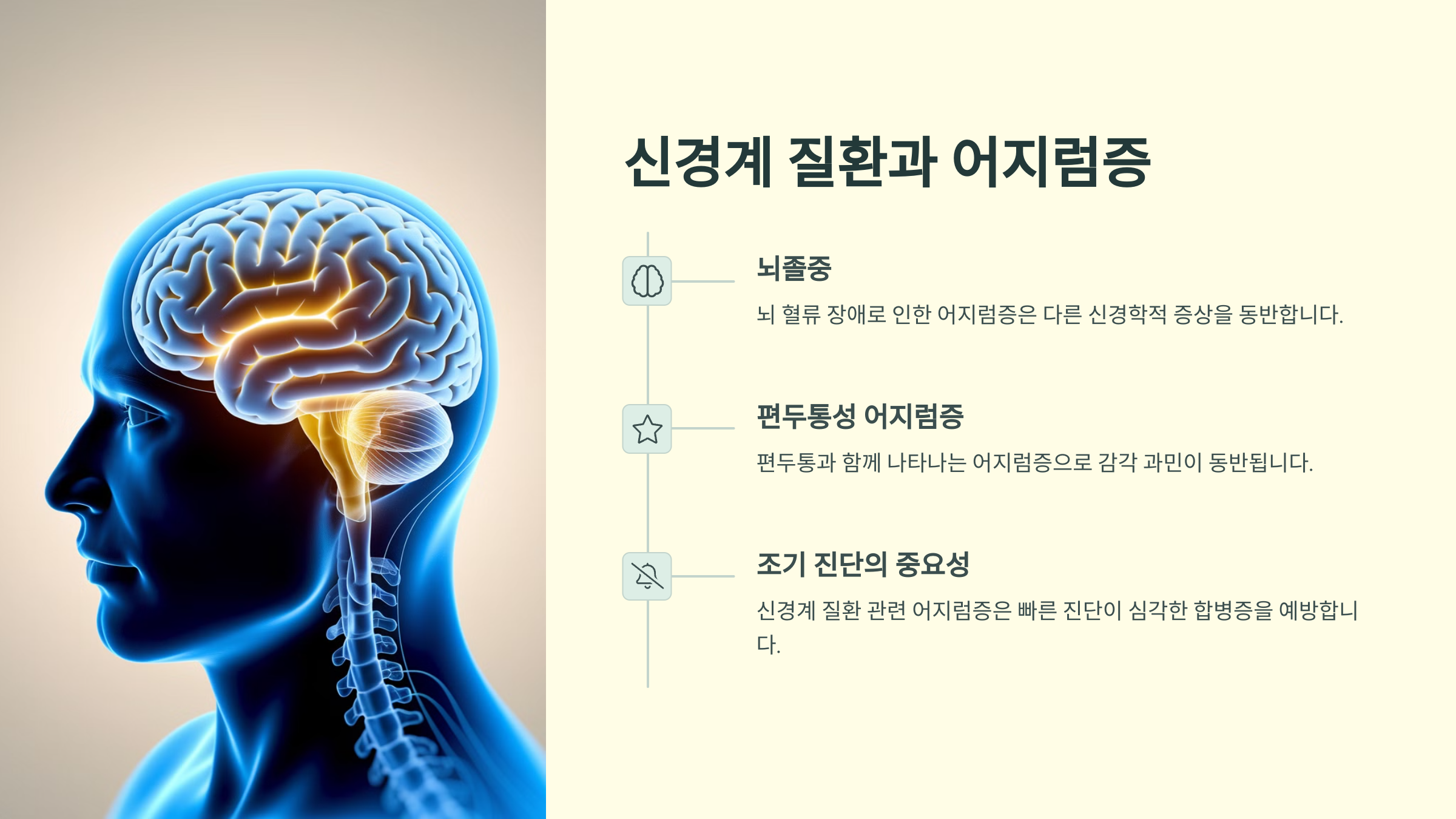 어지럼증은 때로는 뇌의 문제에서 시작되기도 해요. 특히 뇌졸중, 뇌종양, 다발성 경화증 등 신경계 이상이 있을 경우 평형감각을 담당하는 부위에 영향을 주기 때문에 갑작스럽고 강한 어지럼증이 나타날 수 있어요.