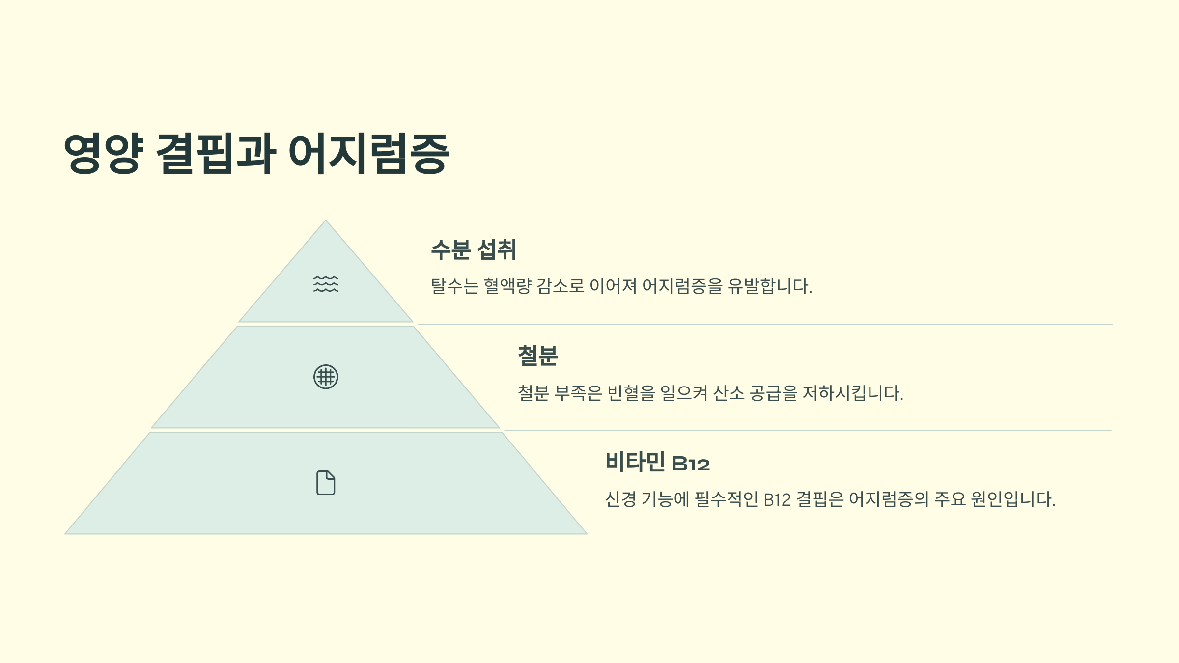 철분, 비타민B12, 마그네슘, 엽산 등이 부족하면 어지럼증이 생길 수 있어요. 특히 빈혈은 혈액 내 산소 운반 능력이 떨어져 뇌로 가는 산소가 부족해지면서 어지럼을 유발하죠.