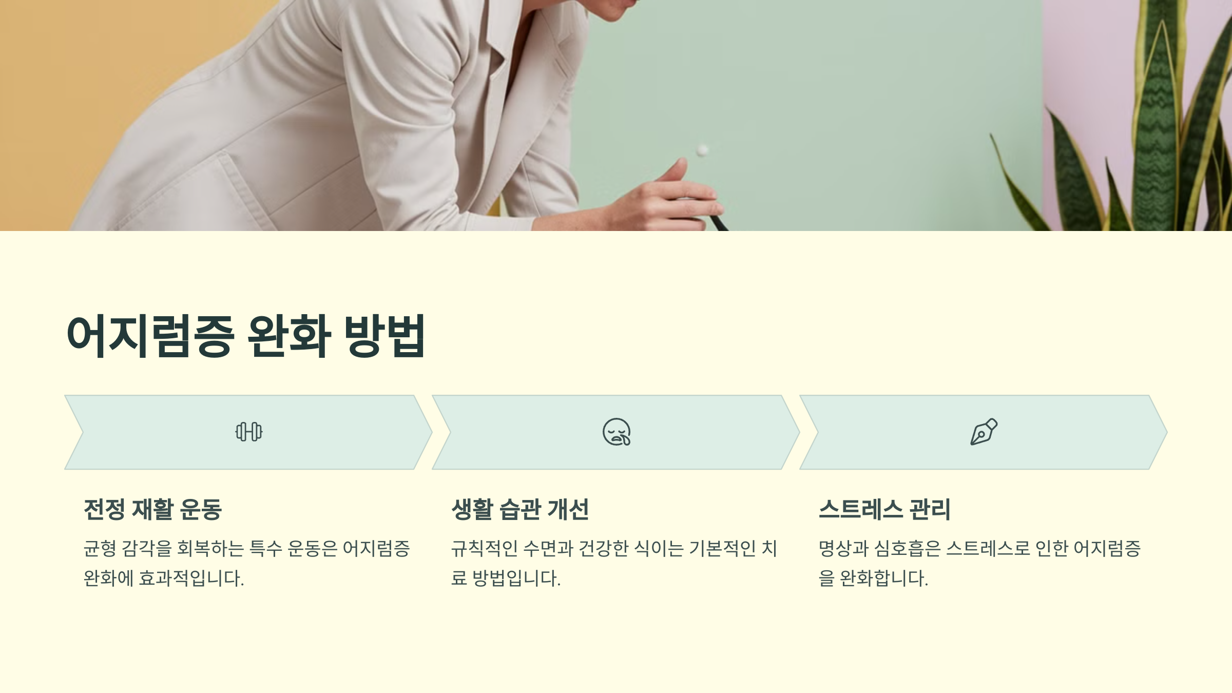 스트레스 완화와 충분한 수면, 수분 섭취, 적절한 운동 등은 모든 유형의 어지럼증을 완화하는 데 기본이 되는 생활 습관이에요. 또한 어지러울 때는 바로 누워서 눈을 감고, 조명이 밝은 곳에서 휴식을 취하는 게 좋아요.