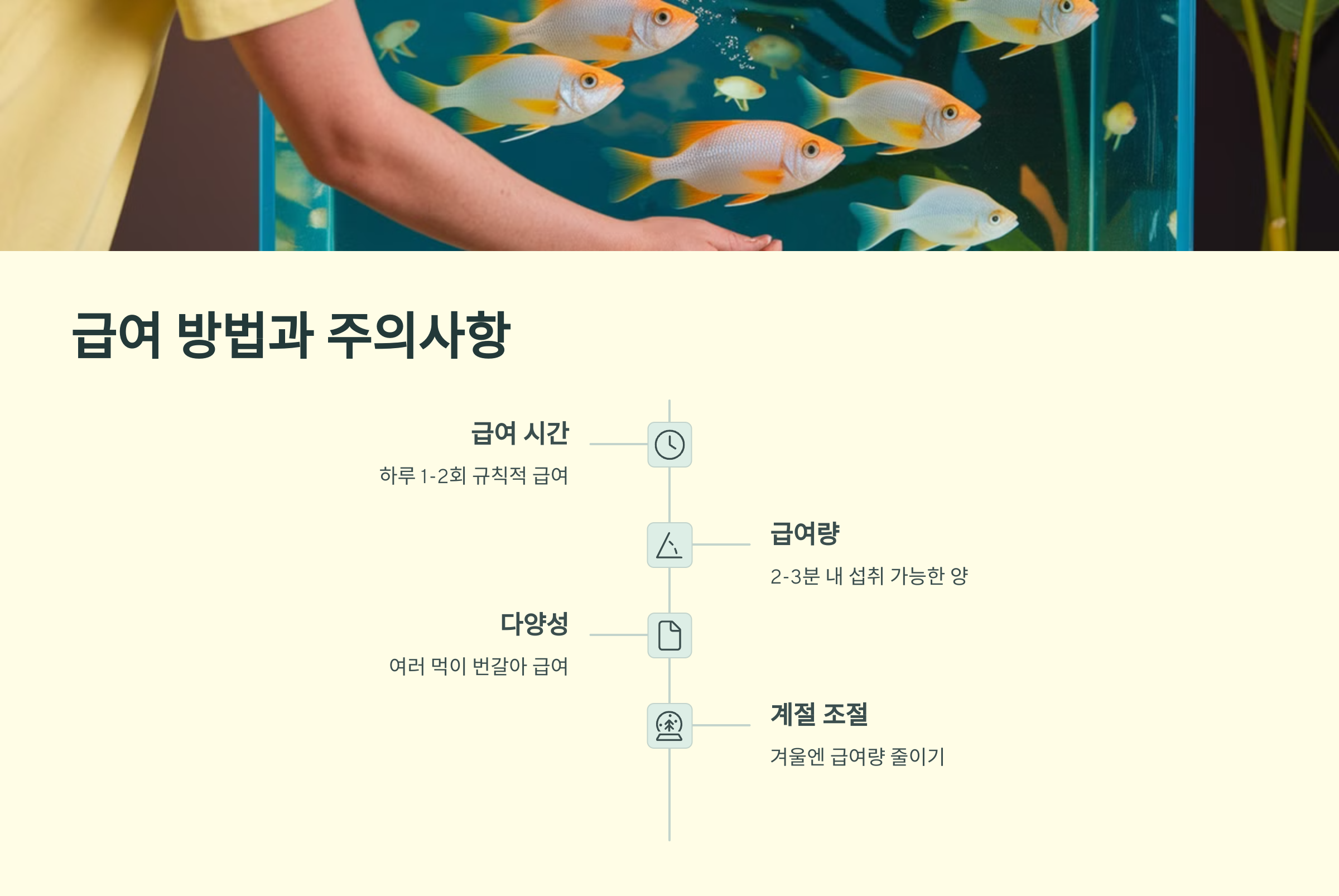 초보자는 플레이크나 펠렛 사료를 사용하는 것이 가장 편리해요. 🐟