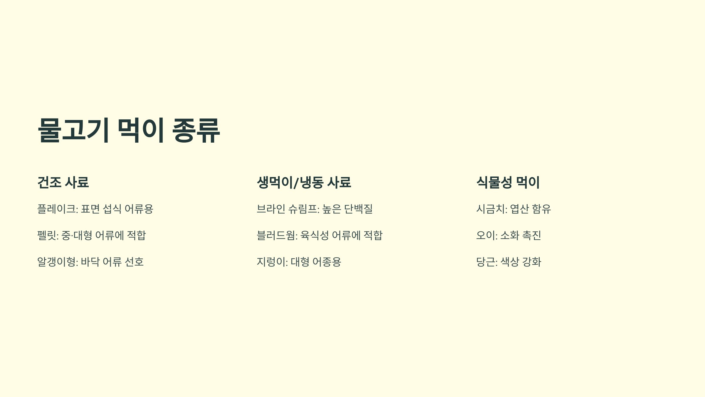 물고기의 먹이는 크게 인공 사료, 생먹이, 냉동 먹이, 채소류로 나뉘어요. 각 먹이의 특징을 알고 물고기에게 맞는 먹이를 선택하는 것이 중요해요.