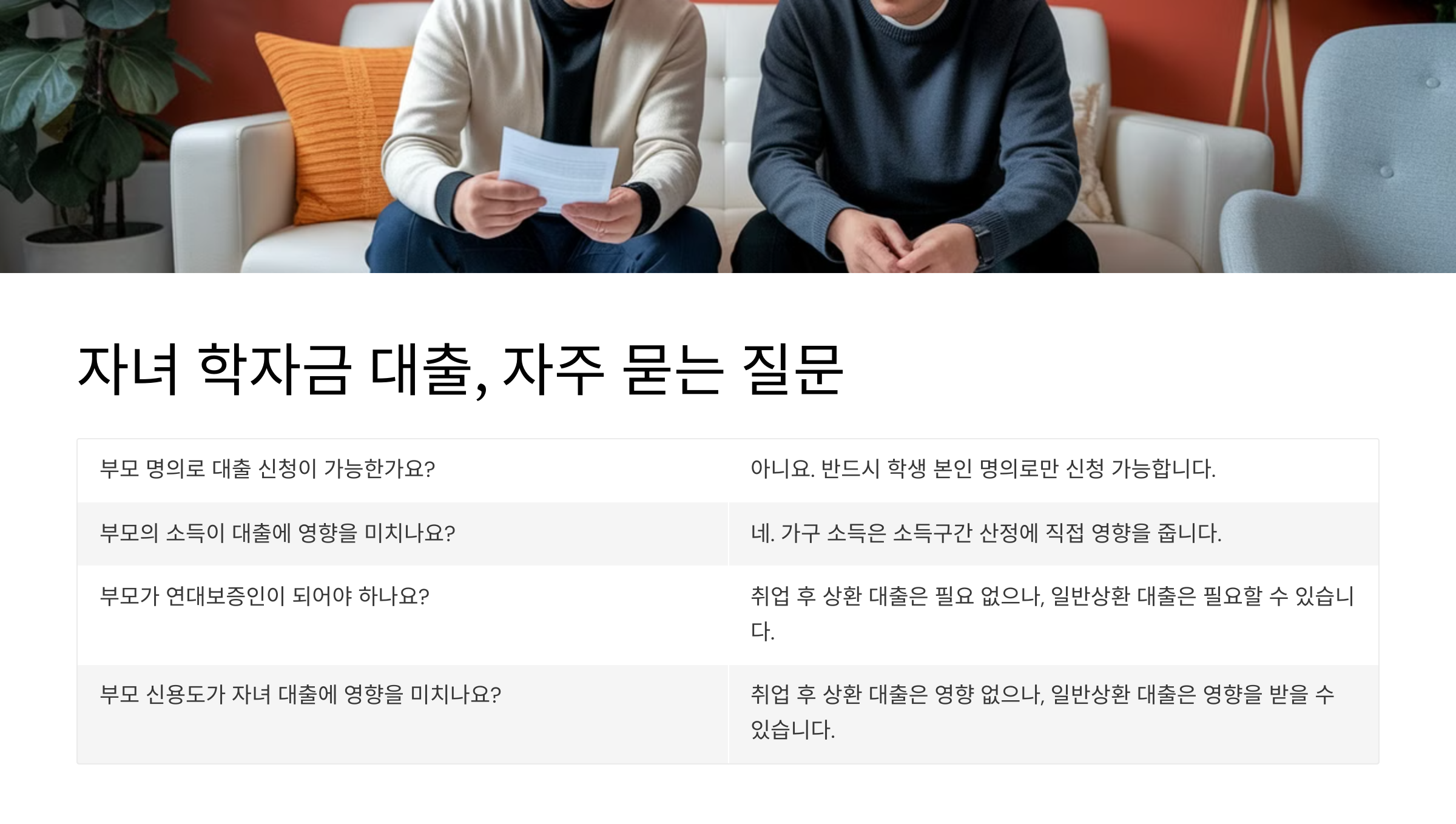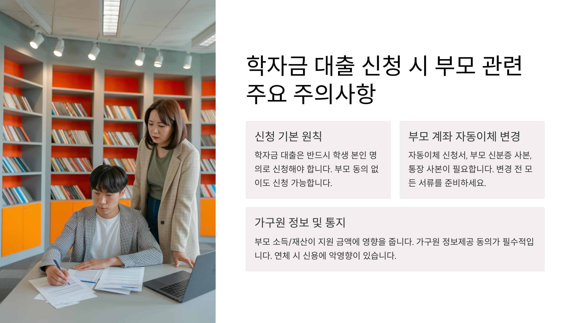 많은 부모님들이 자녀 학자금 대출을 대신 신청할 수 있는지 궁금해하세요. 하지만 학자금 대출은 반드시 학생 본인 명의로 신청해야 해요. 부모님이 직접 대출을 받을 수는 없고, 보증인으로도 설정되지 않아요.