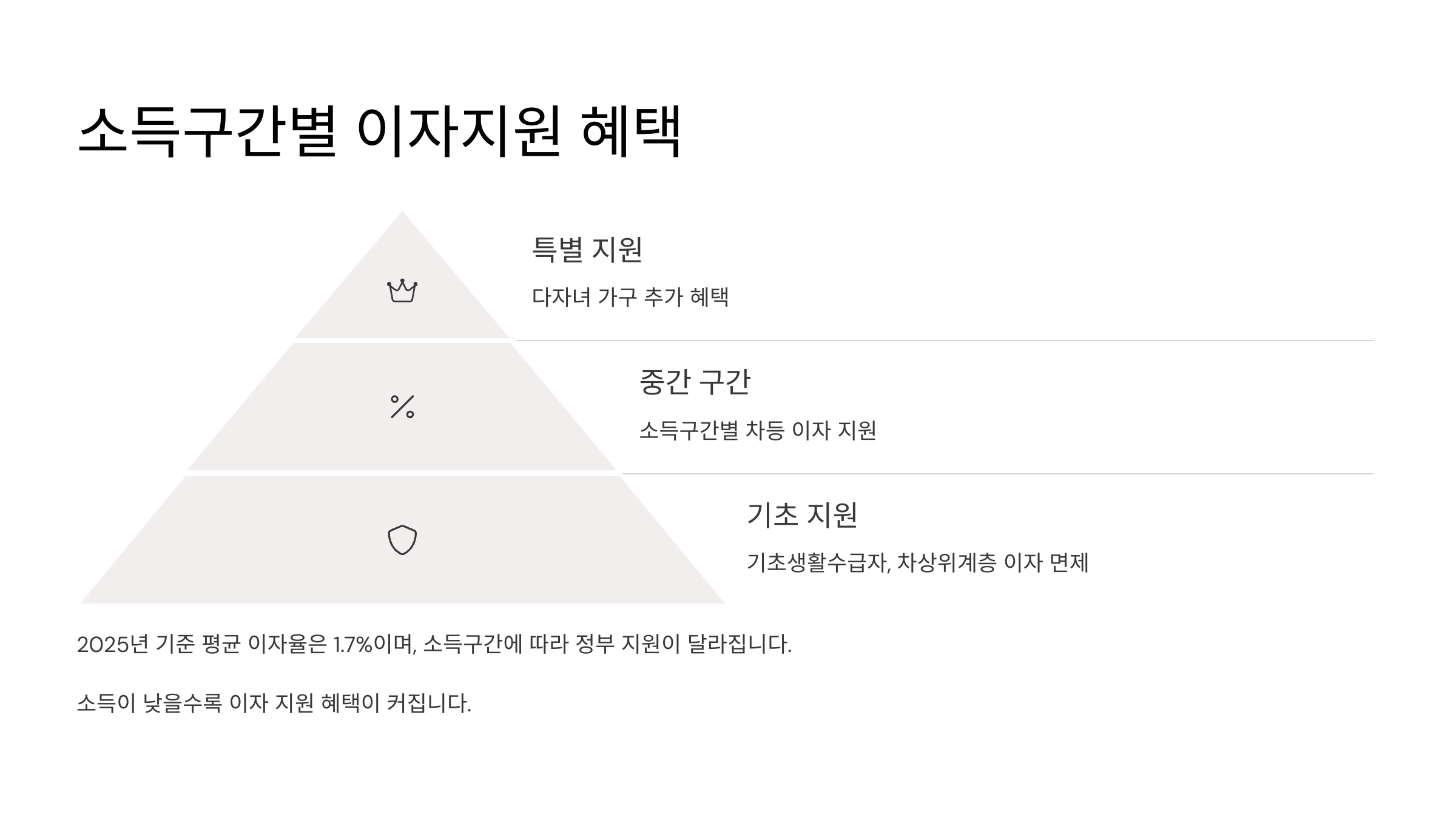 | 소득구간 | 이자 지원 내용 | 추가 지원 여부 |