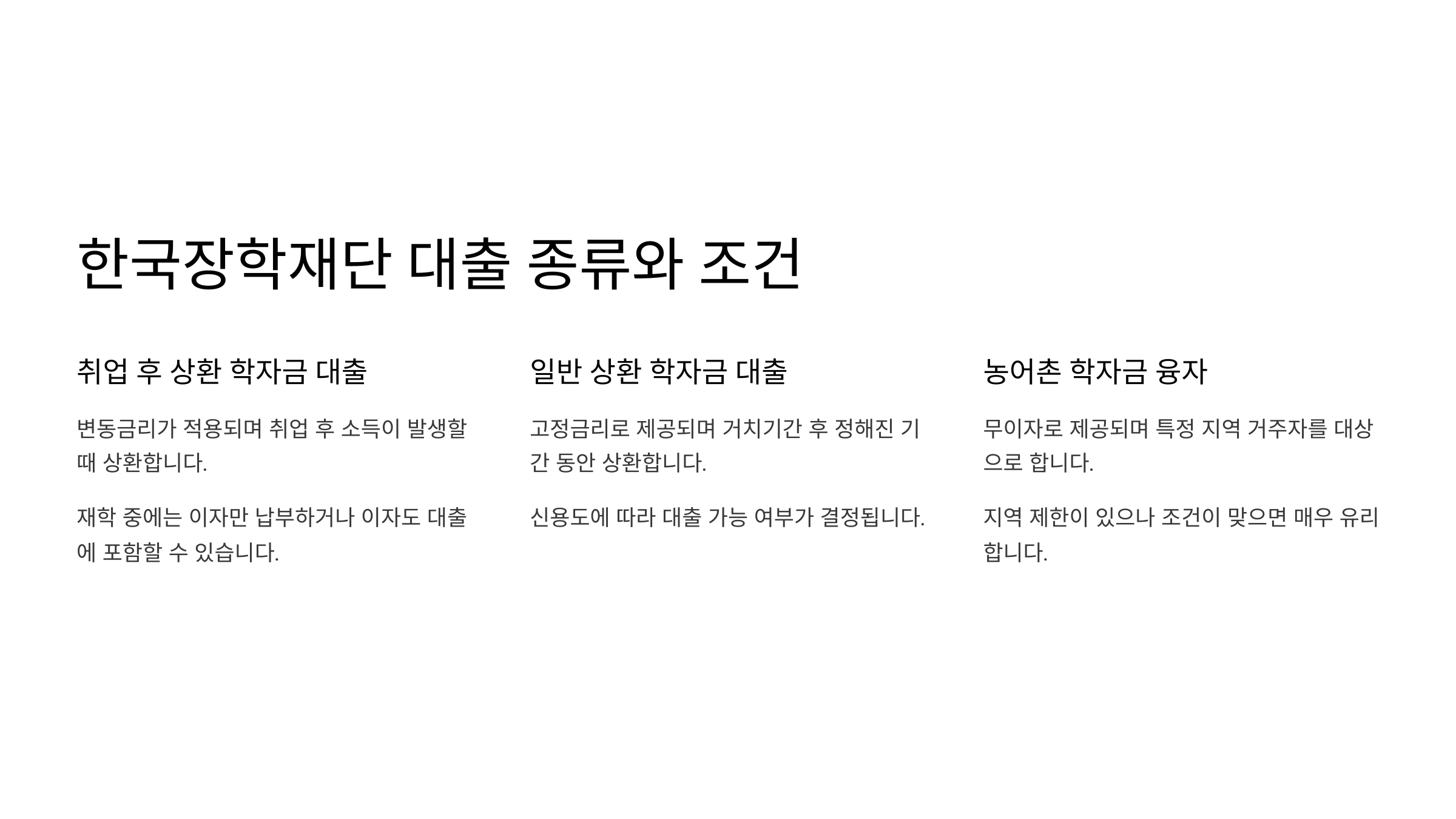 ✅ **취업 후 상환 학자금 대출**: 졸업 후 일정 소득이 발생한 뒤부터 상환 시작